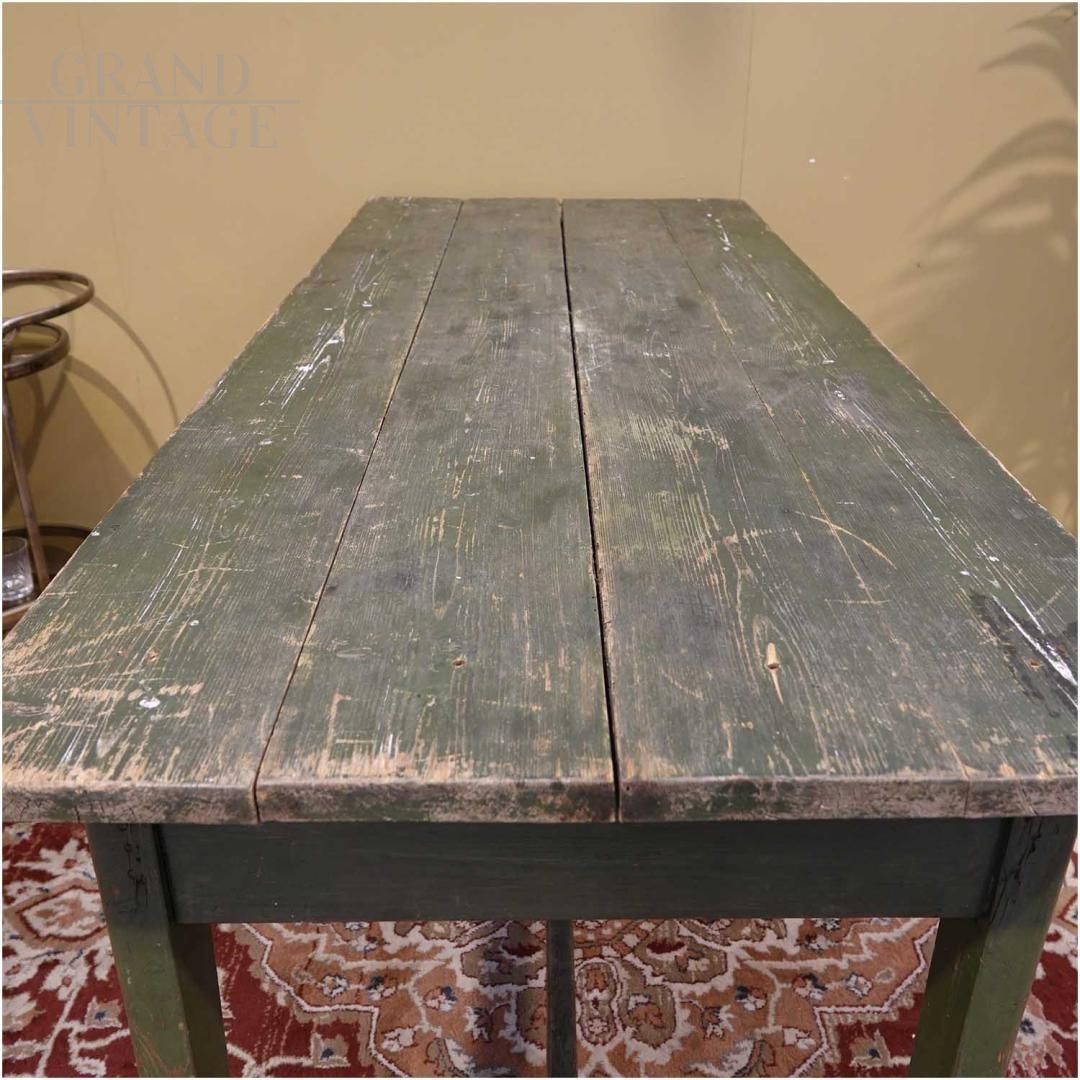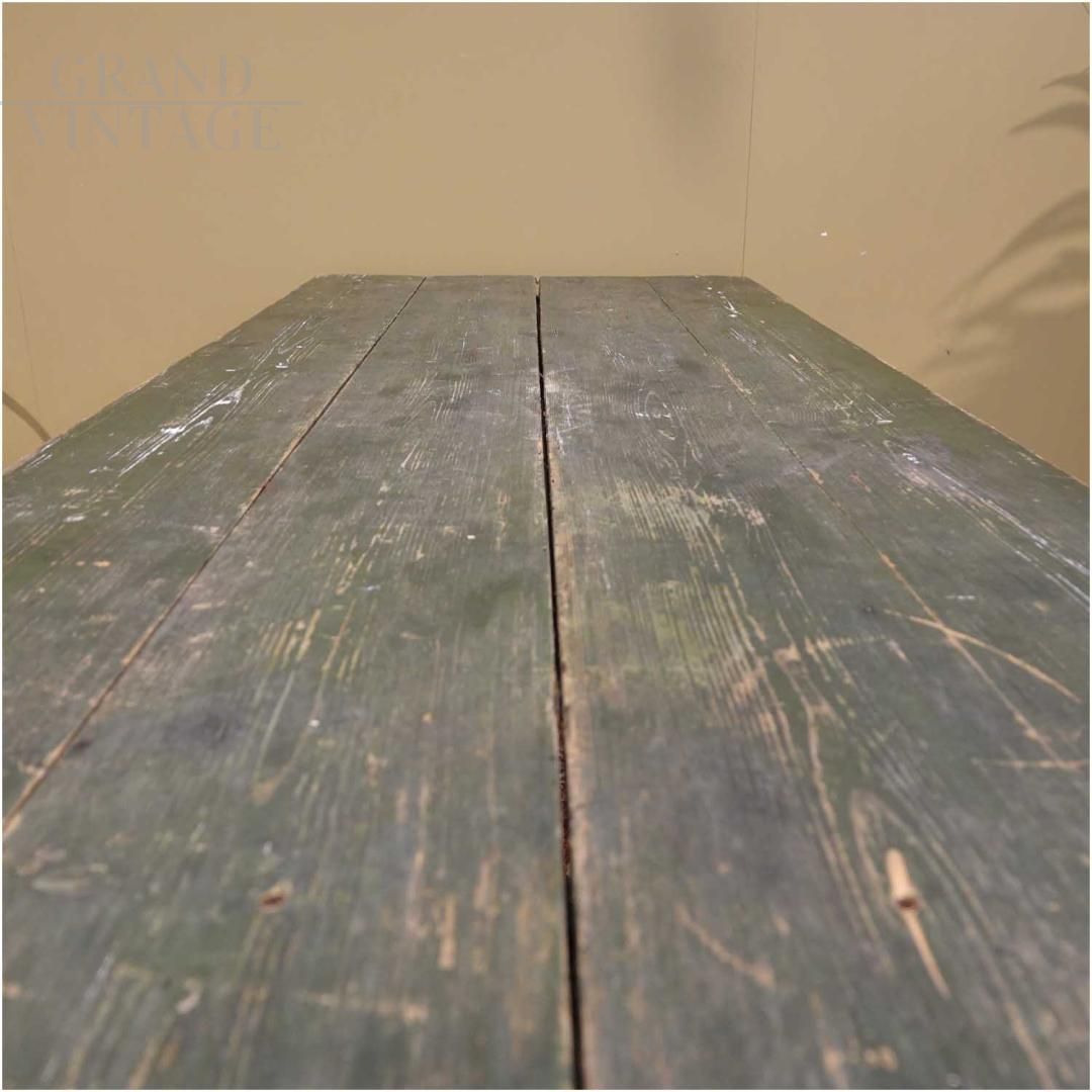 Tavolo in legno dipinto verde, impreziosito da una splendida patina vintage originale. Ogni segno del tempo, ogni graffio racconta una storia, rendendolo un pezzo unico e ricco di carattere. Ideale per ambientazioni rustiche, set fotografici, eventi o produzioni che richiedono un arredo autentico e dal fascino vissuto.