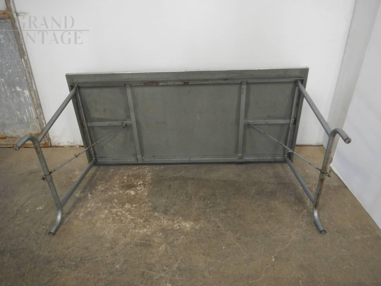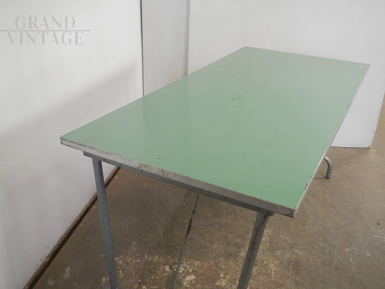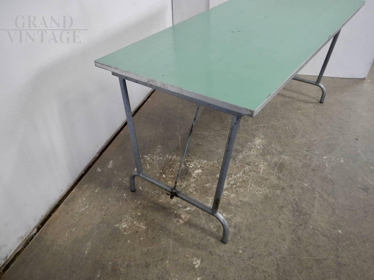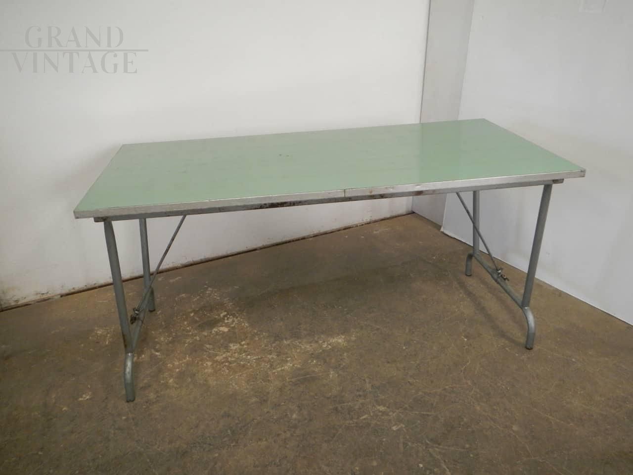 Tavolo pieghevole vintage in ferro zincato con piano in legno compresso e formica verde. Il tavolo presenta segni d’uso nel piano e in alcune parti della struttura. Trattato con vernice da ferro che lo rende liscio al tatto.