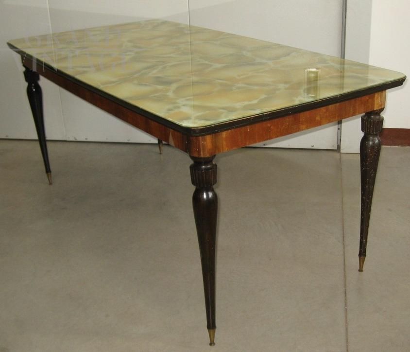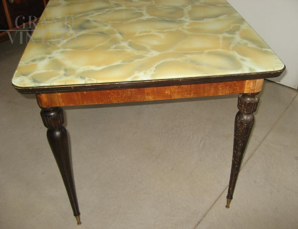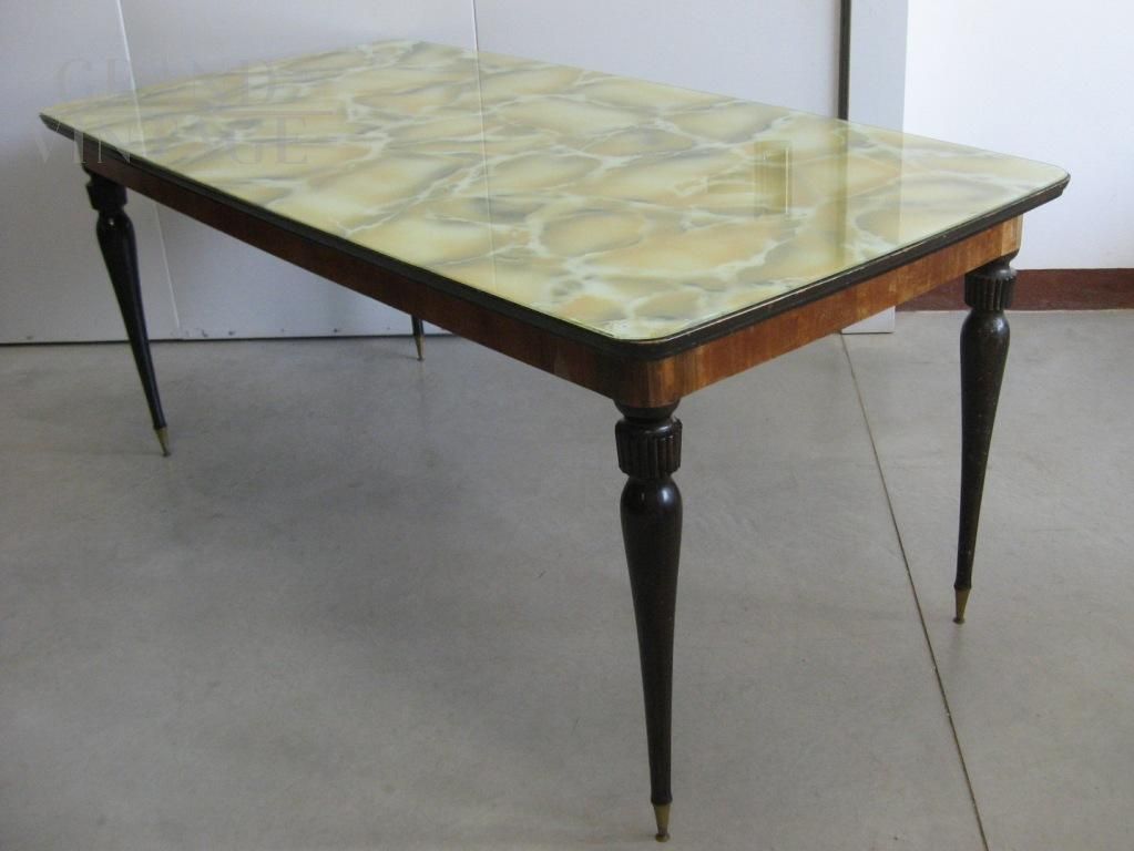 Tavolo vintage rettangolare anni '60 modernariato Italiano con piano in vetro maculato marmorizzato. in perfette condizioni. Piedi tinti scuri e fascia impiallacciata in noce. Il tavolo si presenta in buone condizioni generali non restaurato.