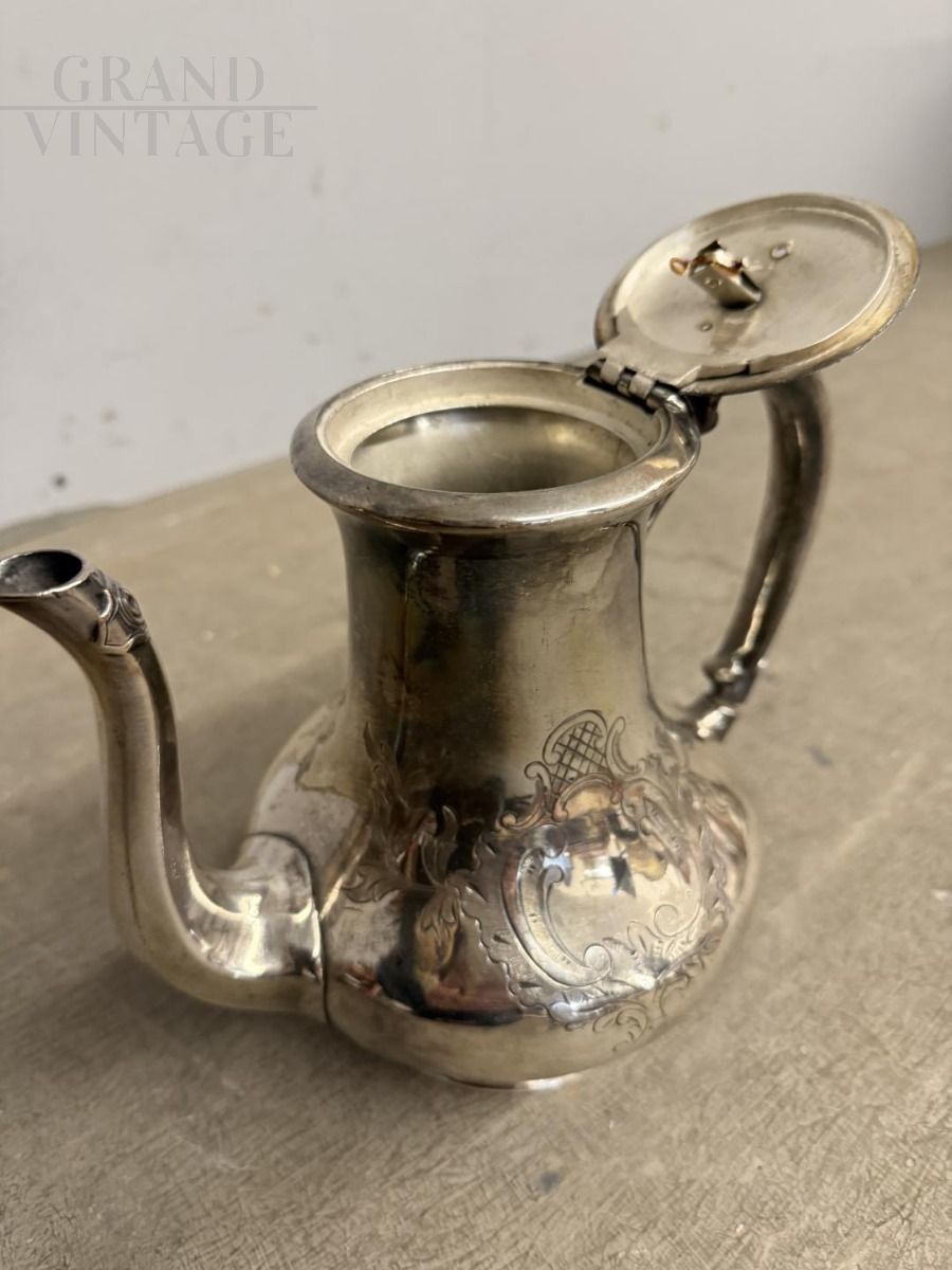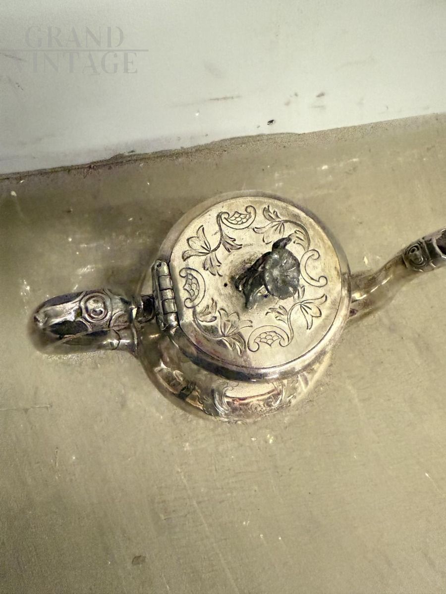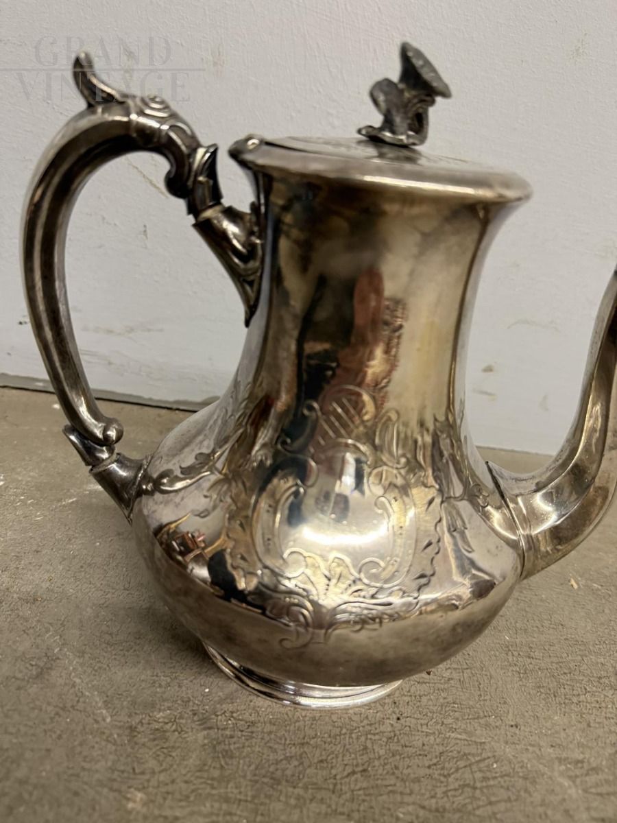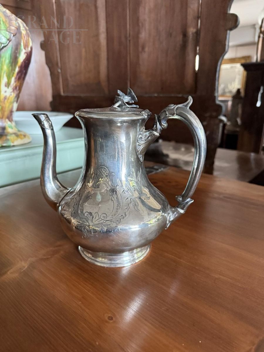 Antique Sheffield silver teapot from the late 19th century with Shaw & Fisher mark on the bottom, height 22 cm, width 24 cm.