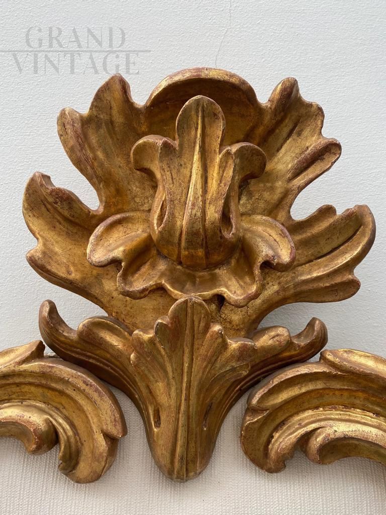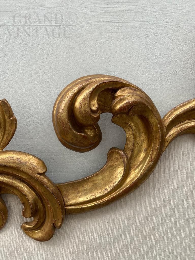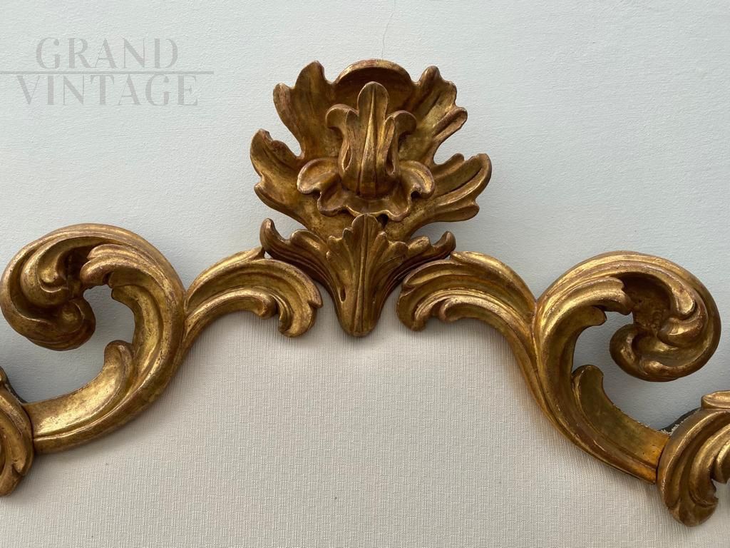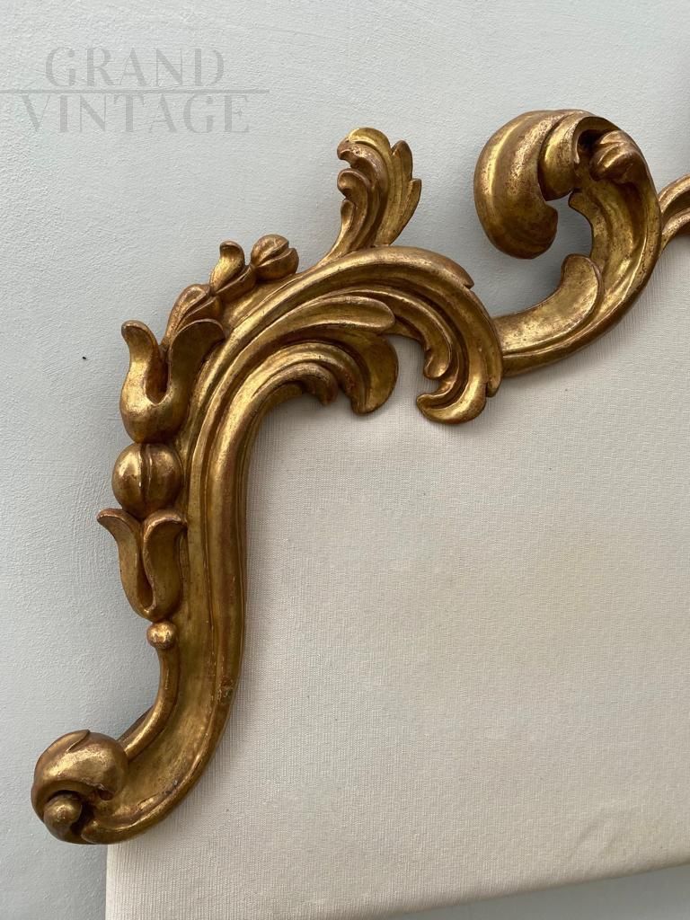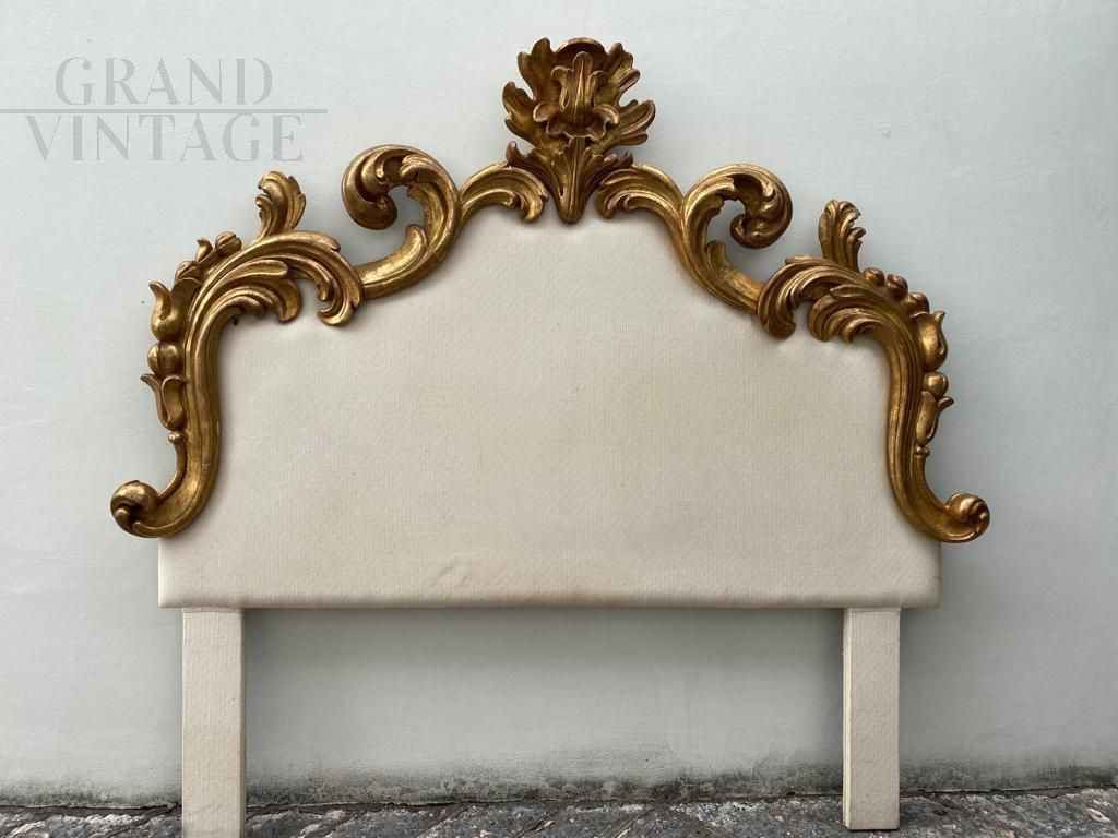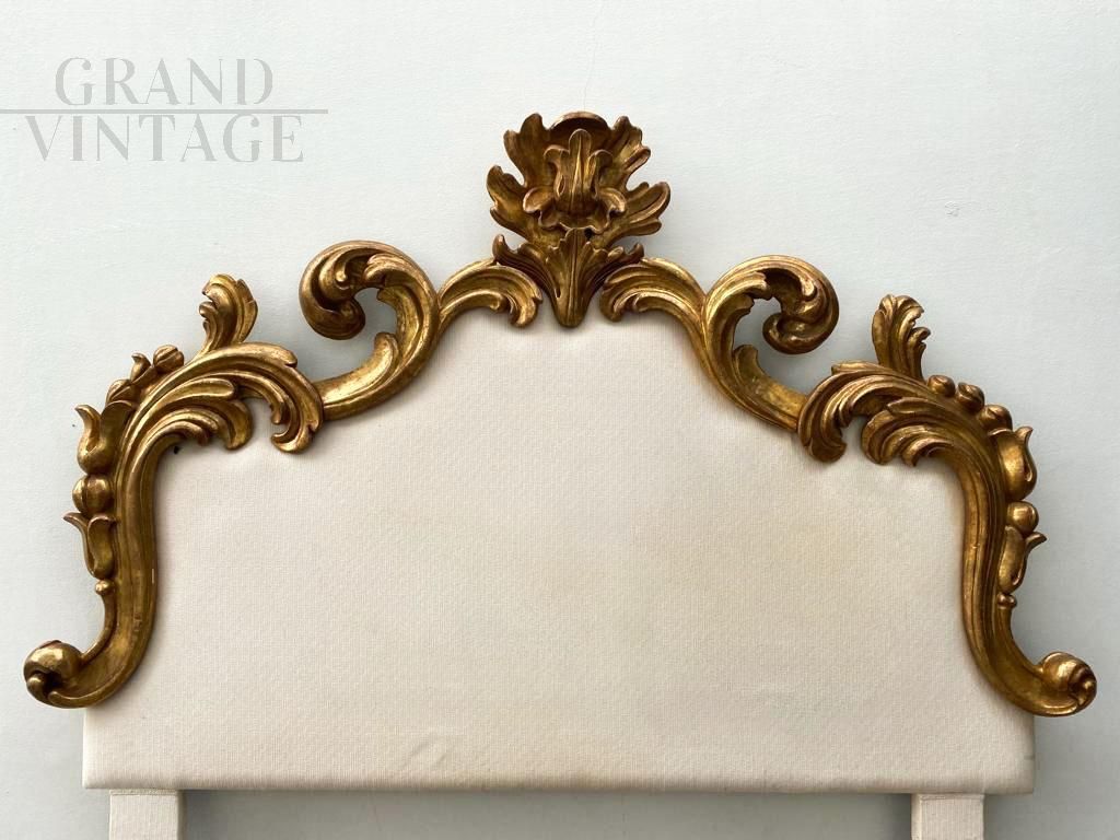 Testiera da letto antica imbottita in tessuto bianco e intagliata a foglia oro