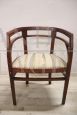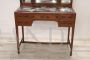 Questo raffinato tavolino da toeletta italiano dei primi del Novecento, accompagnato da una poltrona abbinata, mostra un'eleganza e una funzionalità senza tempo. Realizzato in ricco legno di ciliegio, il tavolo presenta un lussuoso piano in marmo scuro che non solo ne esalta l'estetica, ma assicura anche una facile manutenzione e durata nel tempo. Le linee sono semplici ma raffinate, completate da delicati intagli floreali che aggiungono un tocco di raffinatezza. Le originali maniglie in bronzo sono finemente cesellate e aggiungono un ulteriore tocco di fascino all'insieme. Dotata di cinque spaziosi cassetti, lo specchio in tre parti è regolabile, altezza piano 85 cm. Accompagnata da poltroncina. Buone condizioni, prezzo trattabile.