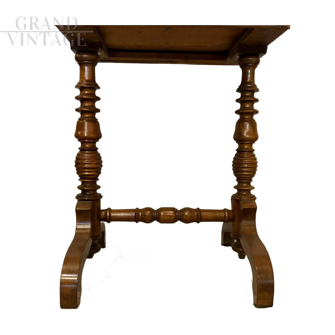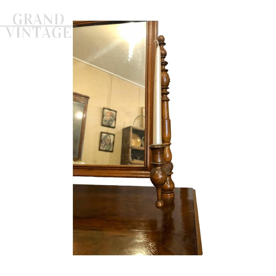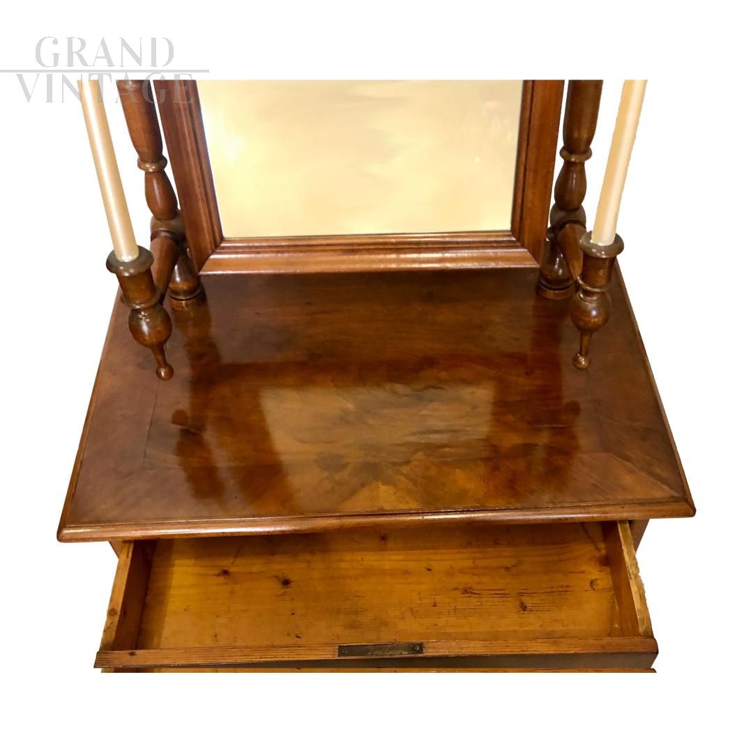 Antica toelette da camera di fine '800 con porta candele laterali, in legno di noce e con un cassetto sul fronte.