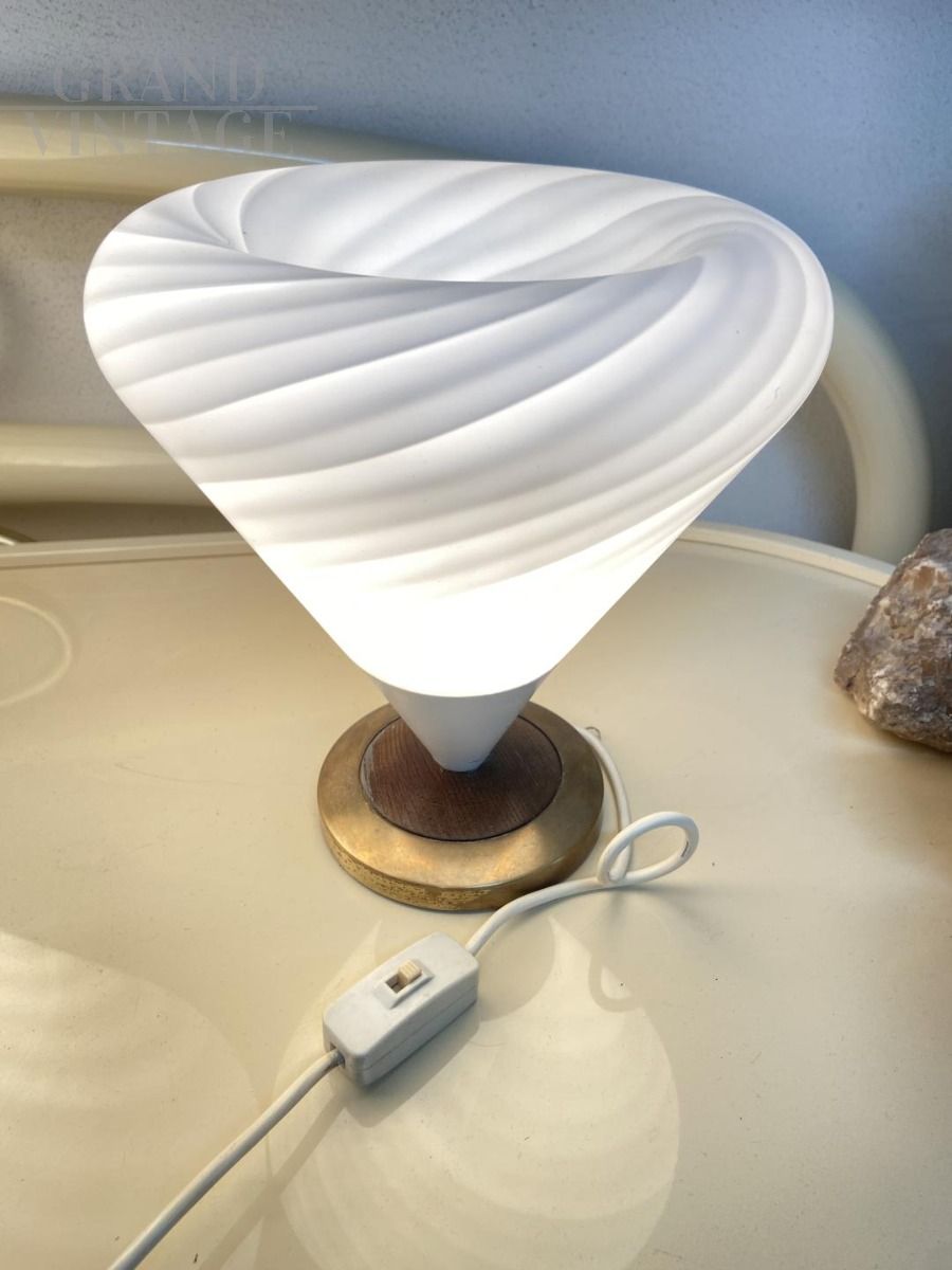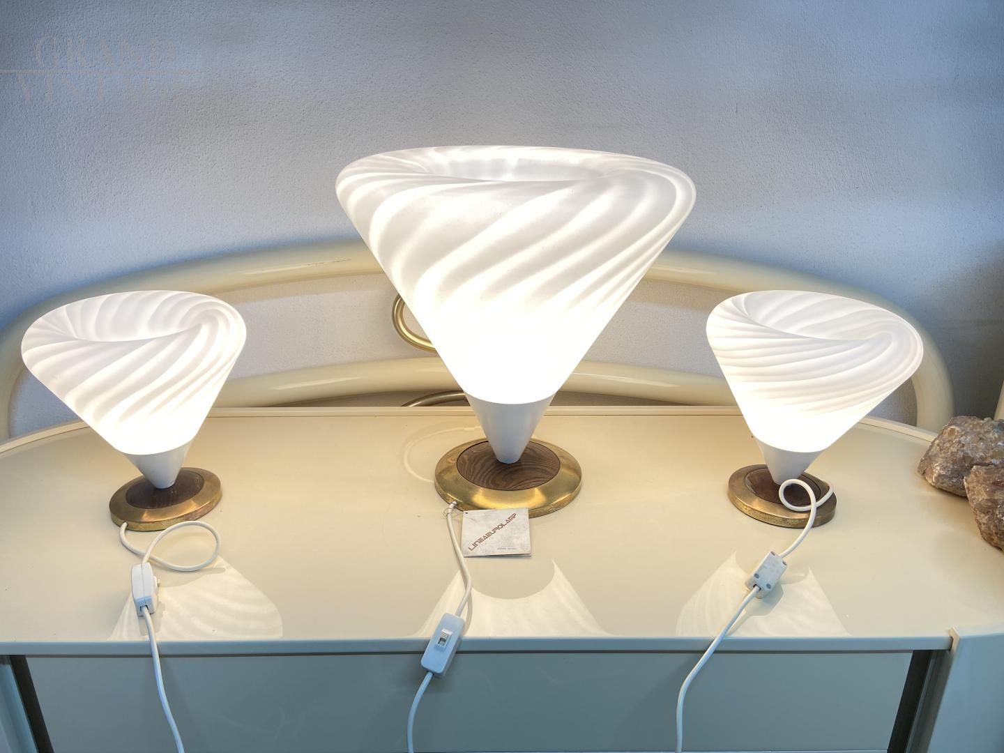 Fantastico tris di lampade da comò e comodini in vetro di Murano artistico lavorato a spirale bianca, Italia anni ‘70, nuovissimi poiché si tratta di rimanenze di negozio, designer: architetto Mino Marini, linea Eurolamp. In vetro di Murano con base in legno e ottone.