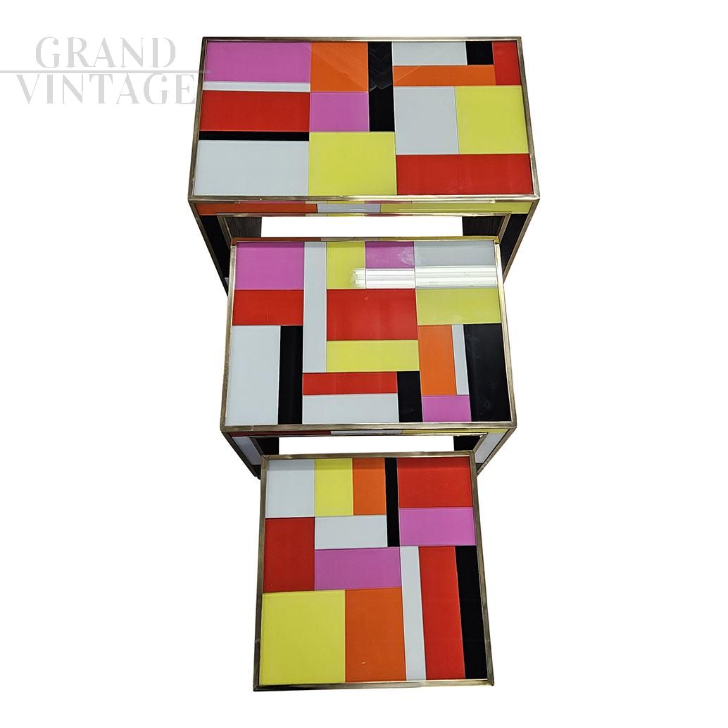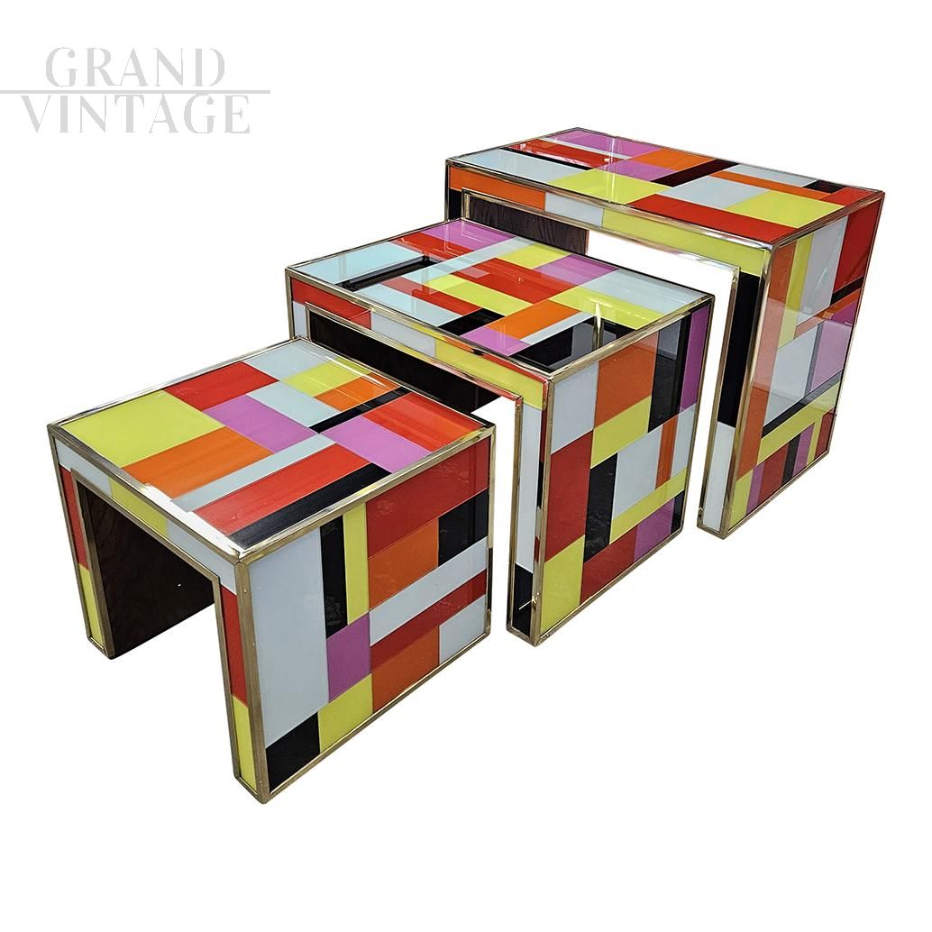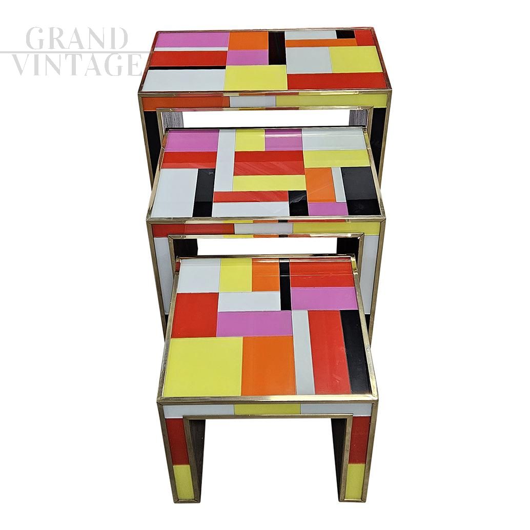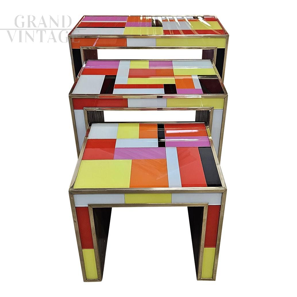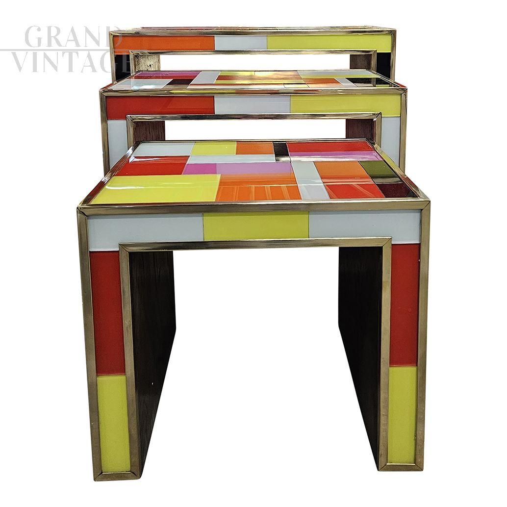 Tris di tavolini impilabili a nido, realizzati a mano in legno e rivestiti in vetro colorato, arricchiti da profili in ottone dorato.