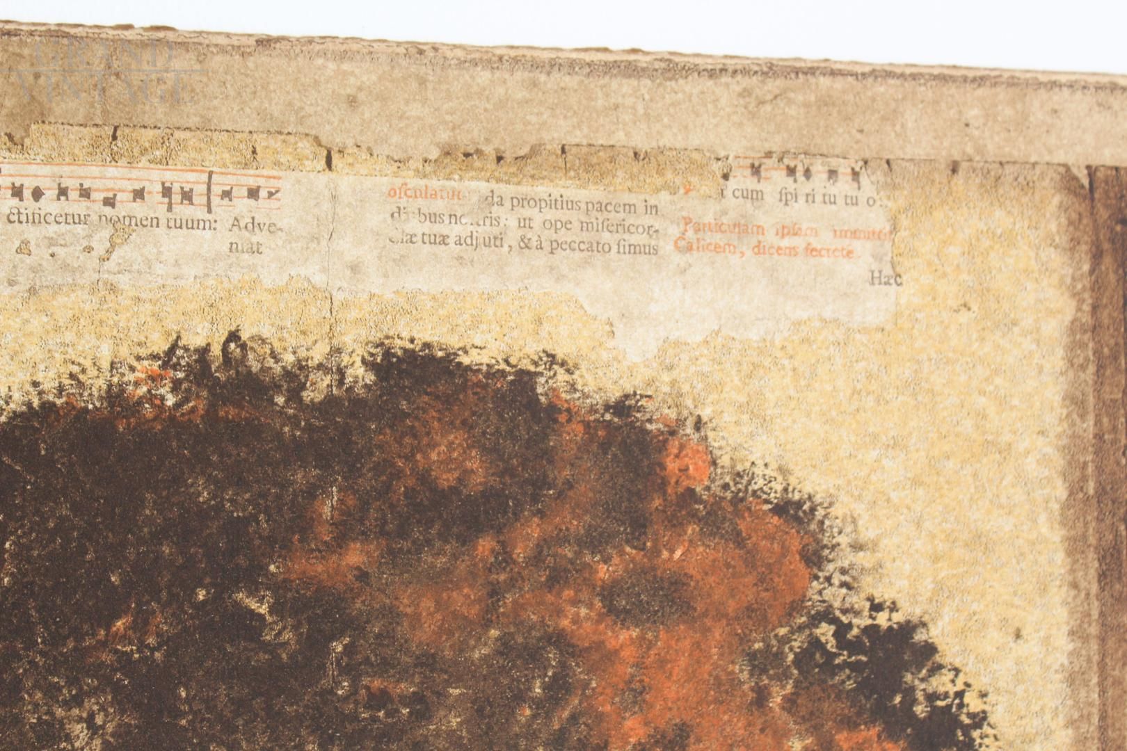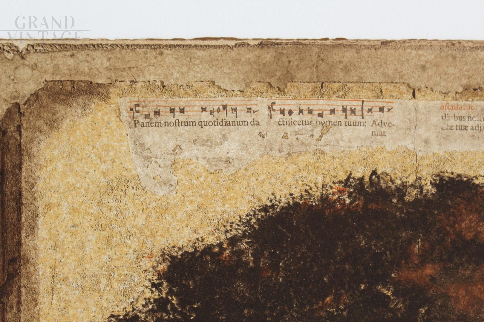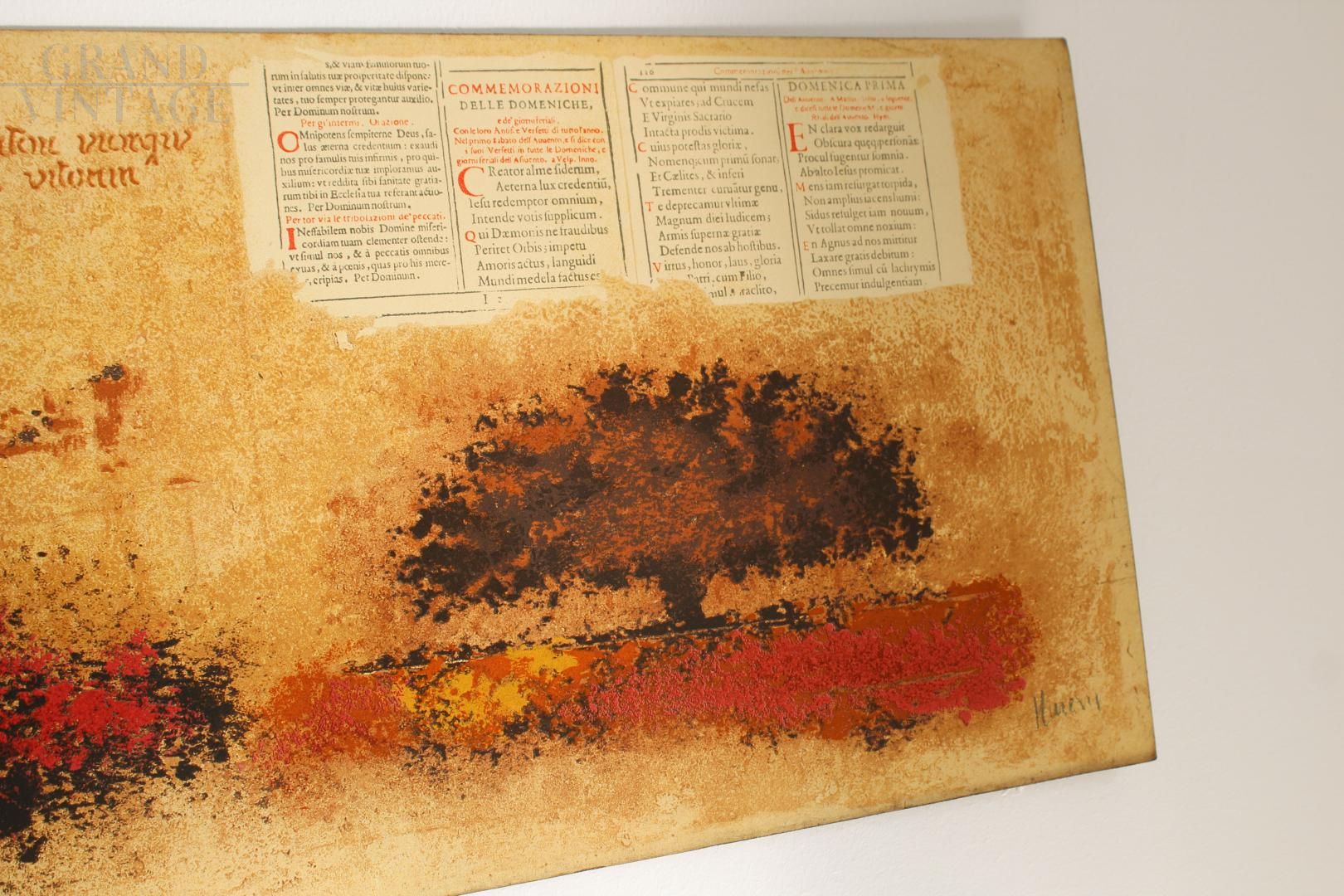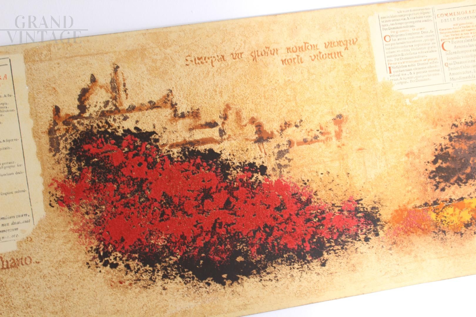 Trittico di dipinti di Antonio Minezzi firmati, olio su preparazione materica su cartone e pagina da Messale settecentesco.
