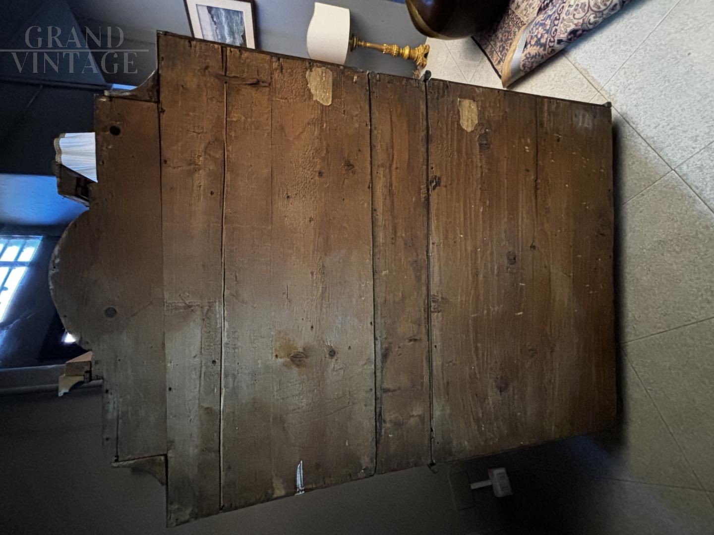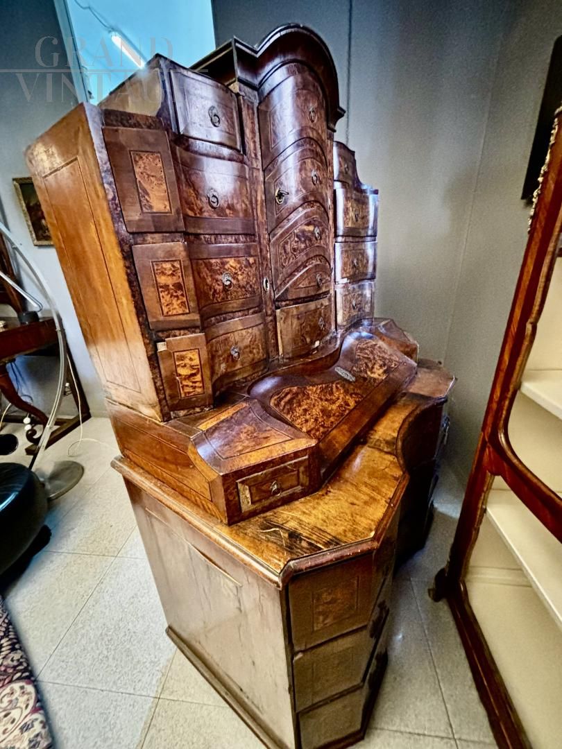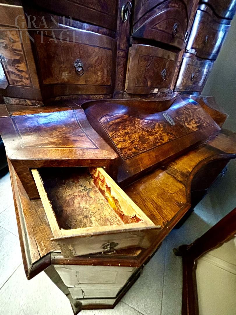 Importante e maestoso trumeau antico Italiano della fine del‘600 dalla magnifica forma mossa, lastronato con radiche di tuia, noce e filetti di ebano, con fronte a cassetti e antina con piano a ribalta che cela segreti. In prima patina, mai restaurato, conserva la sua stupenda patina seicentesca. Il prezzo si riferisce al mobile nello stato attuale, è possibile realizzare un accurato restauro da un restauratore specializzato.