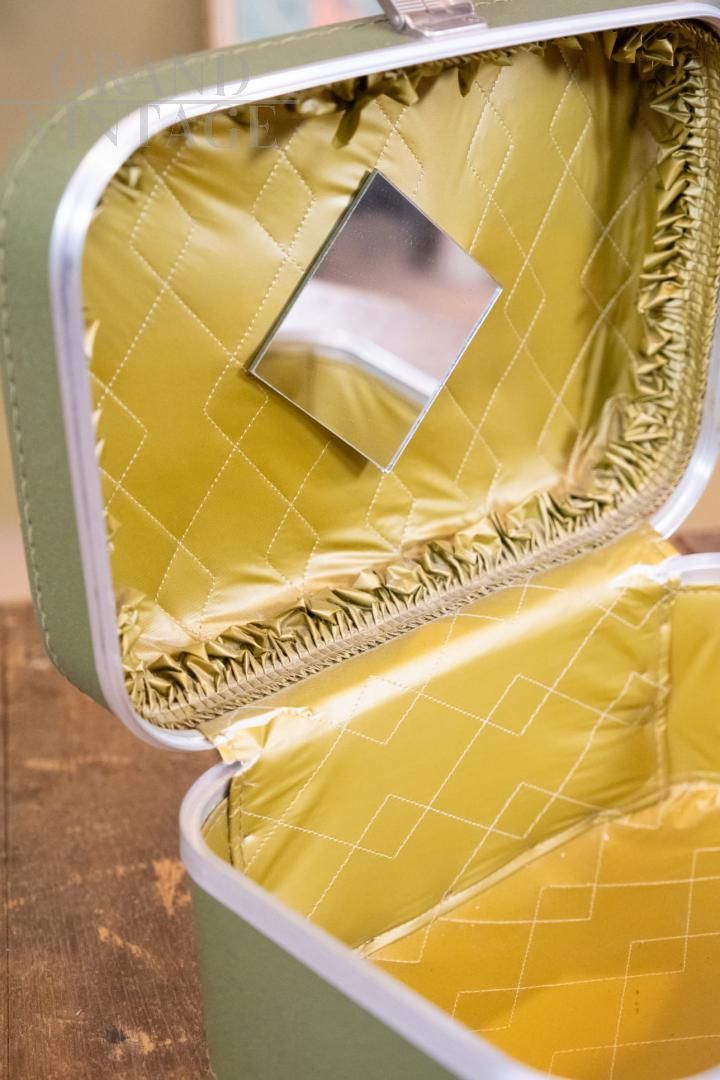 Valigetta beauty case vintage in similpelle verde degli anni ’60 con combinazione e specchietto interno sotto in coperchio, per un tocco di colore vintage e un design che rimanda all’eleganza del passato, perfetto per ogni occasione.