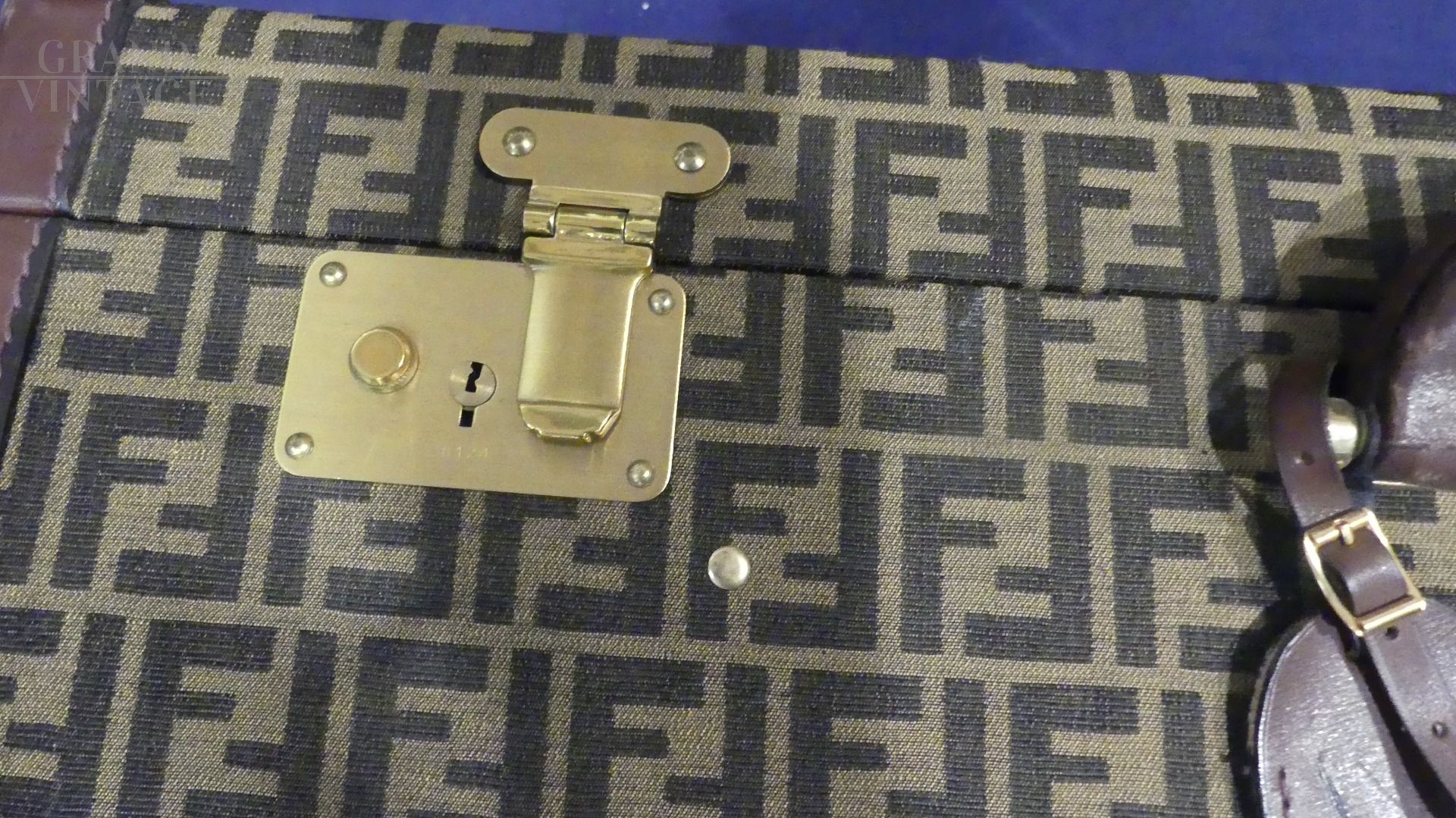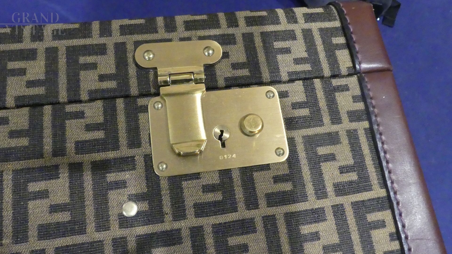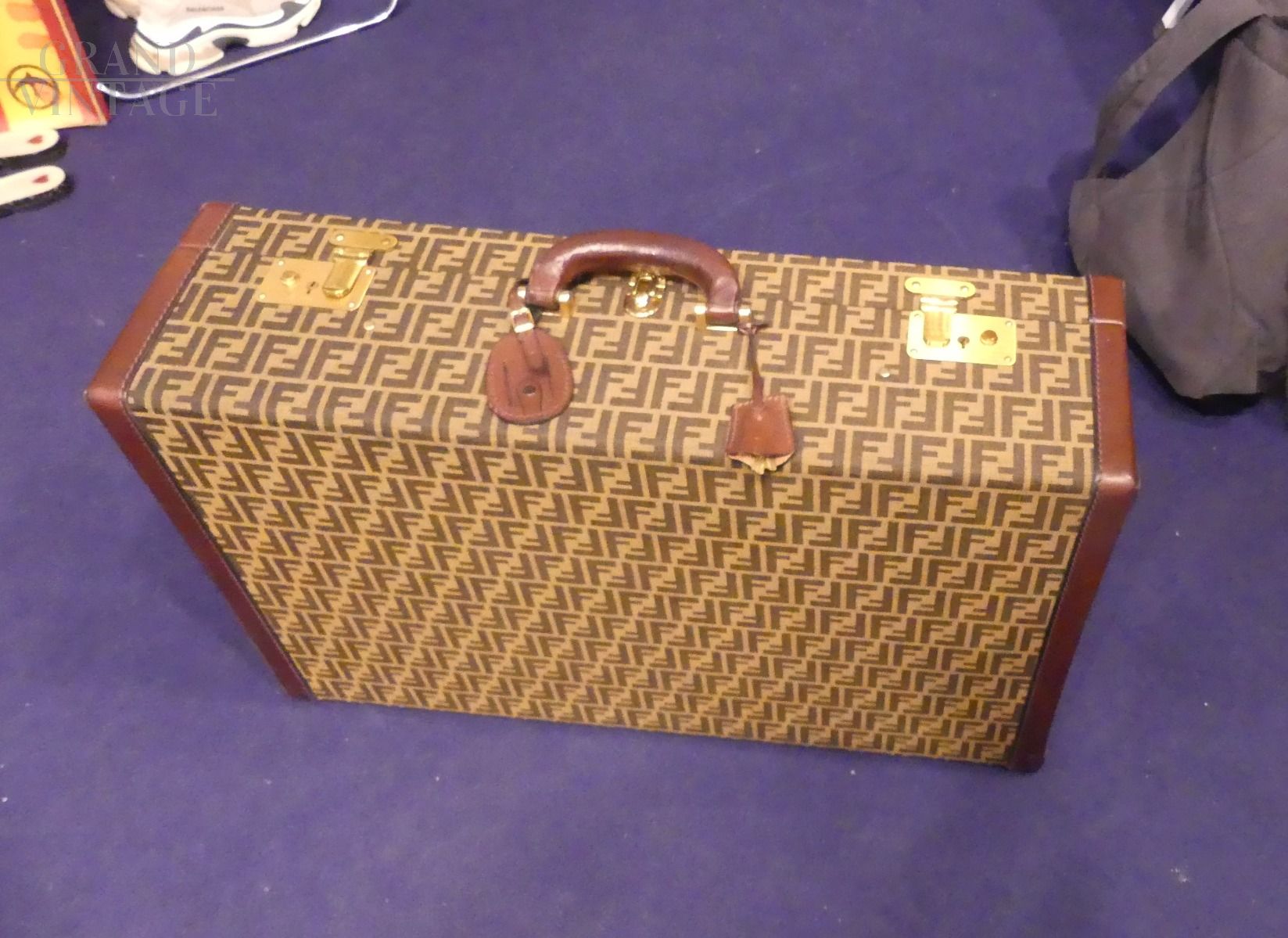 Valigia Fendi originale anni '70 / '80, made in Italy, con struttura in legno e tessuto jacquard marchiato FF Fendi, profili e dettagli in pelle marrone, maniglia unica e doppia chiusura a scatto completa di chiavi, in ottime condizioni.