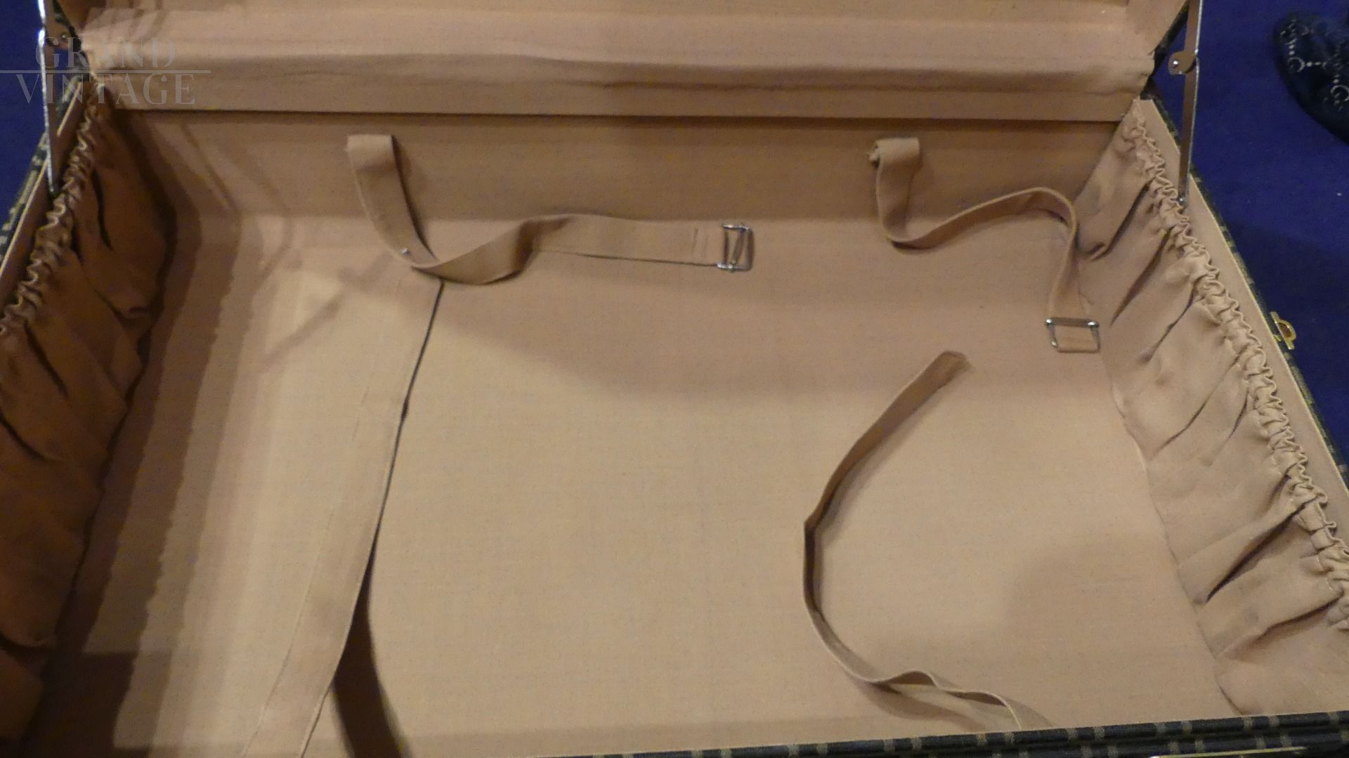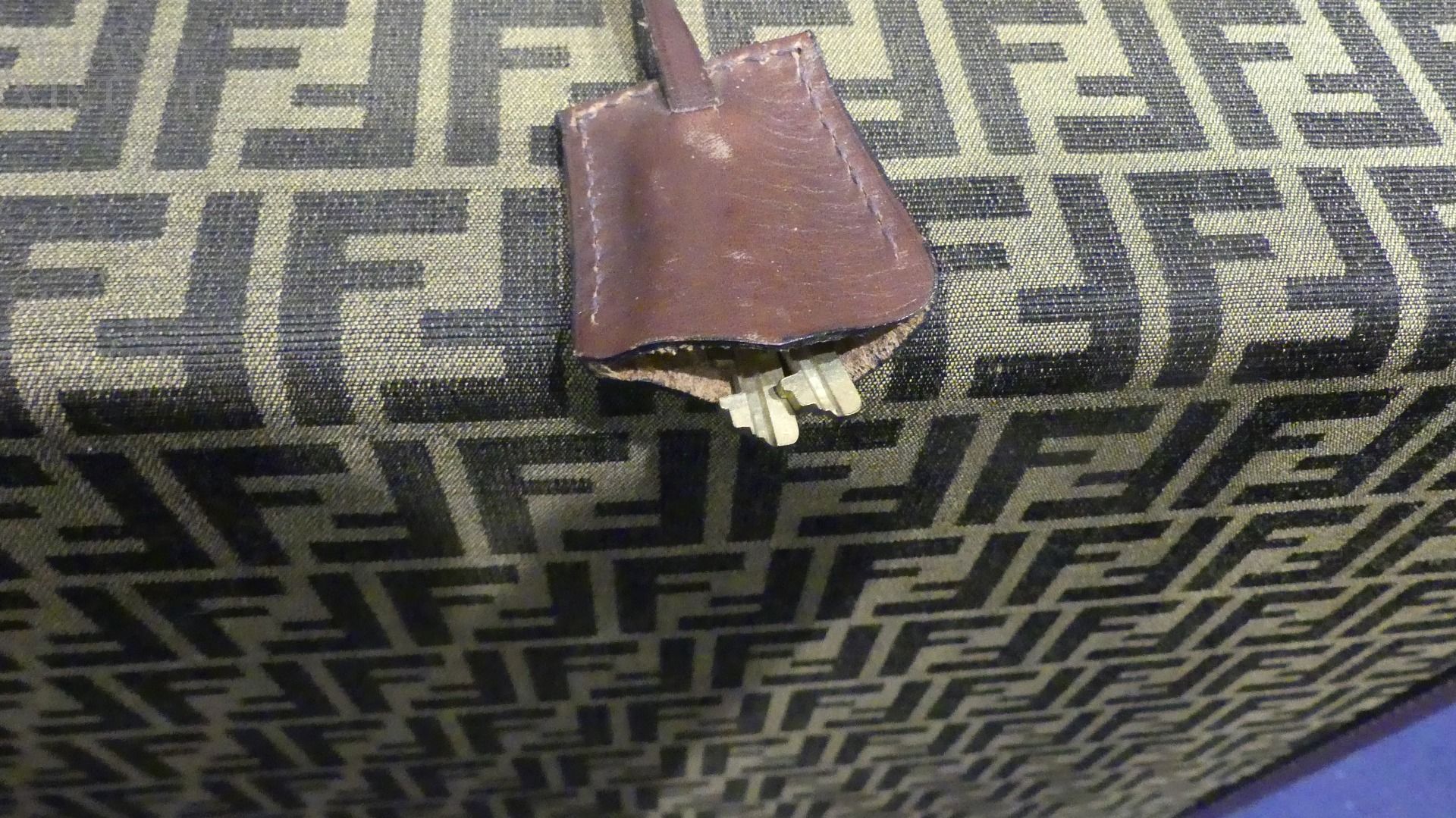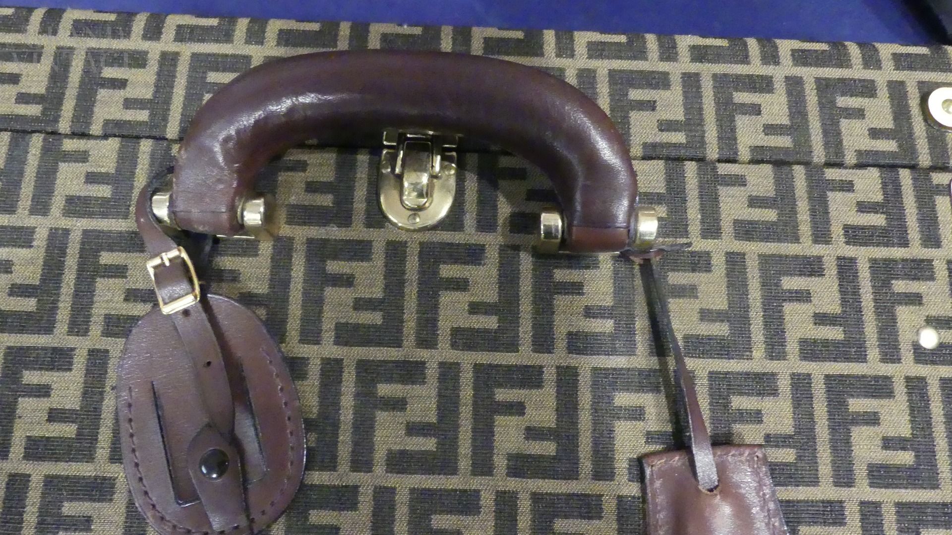 Valigia Fendi originale anni '70 / '80, made in Italy, con struttura in legno e tessuto jacquard marchiato FF Fendi, profili e dettagli in pelle marrone, maniglia unica e doppia chiusura a scatto completa di chiavi, in ottime condizioni.