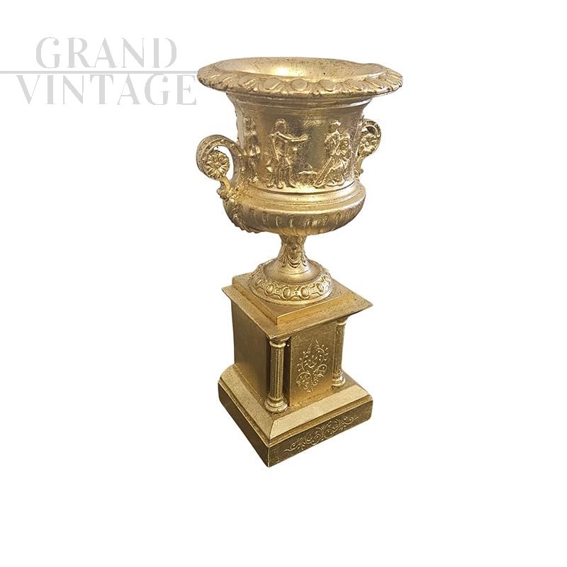 Vaso a colonna in stile classico antico in stucco dorato modellato e decorato con personaggi e motivi vegetali, altezza 28 cm, Italia XX secolo.