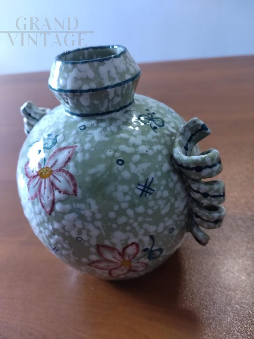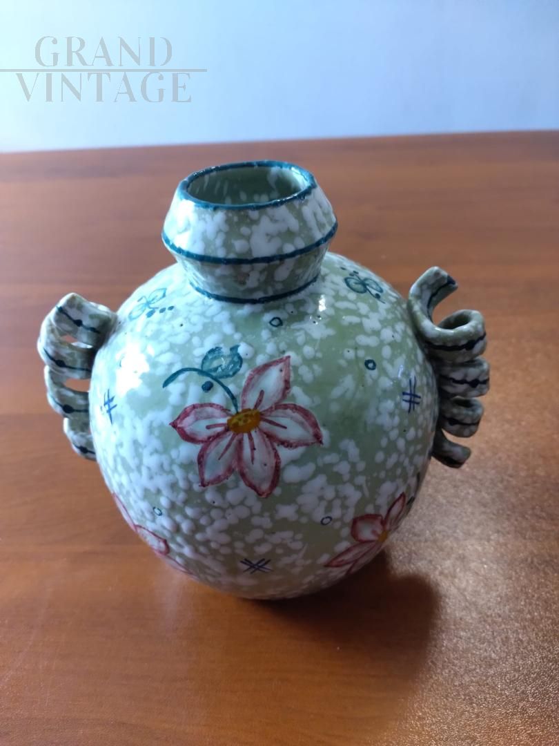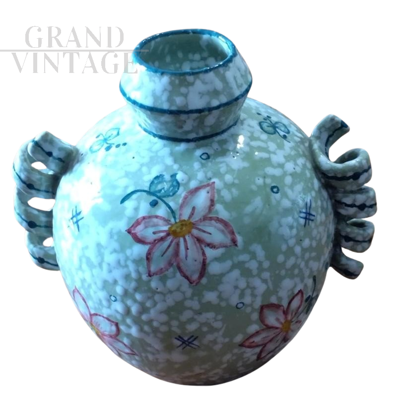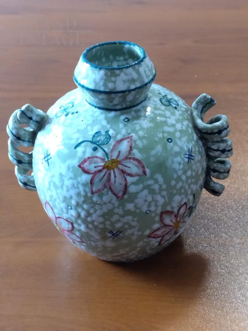 Piccolo vaso ad anfora vintage anni '40 in ceramica maiolica Deruta firmato G. Lamincia E. F., dipinto a mano e decorato da bellissimi manici a spirale. Oggetto vintage mantenuto nelle condizioni originali, potrebbe necessitare di interventi lievi di restauro. Il vaso è comunque in perfette condizioni.