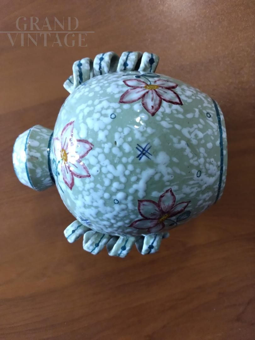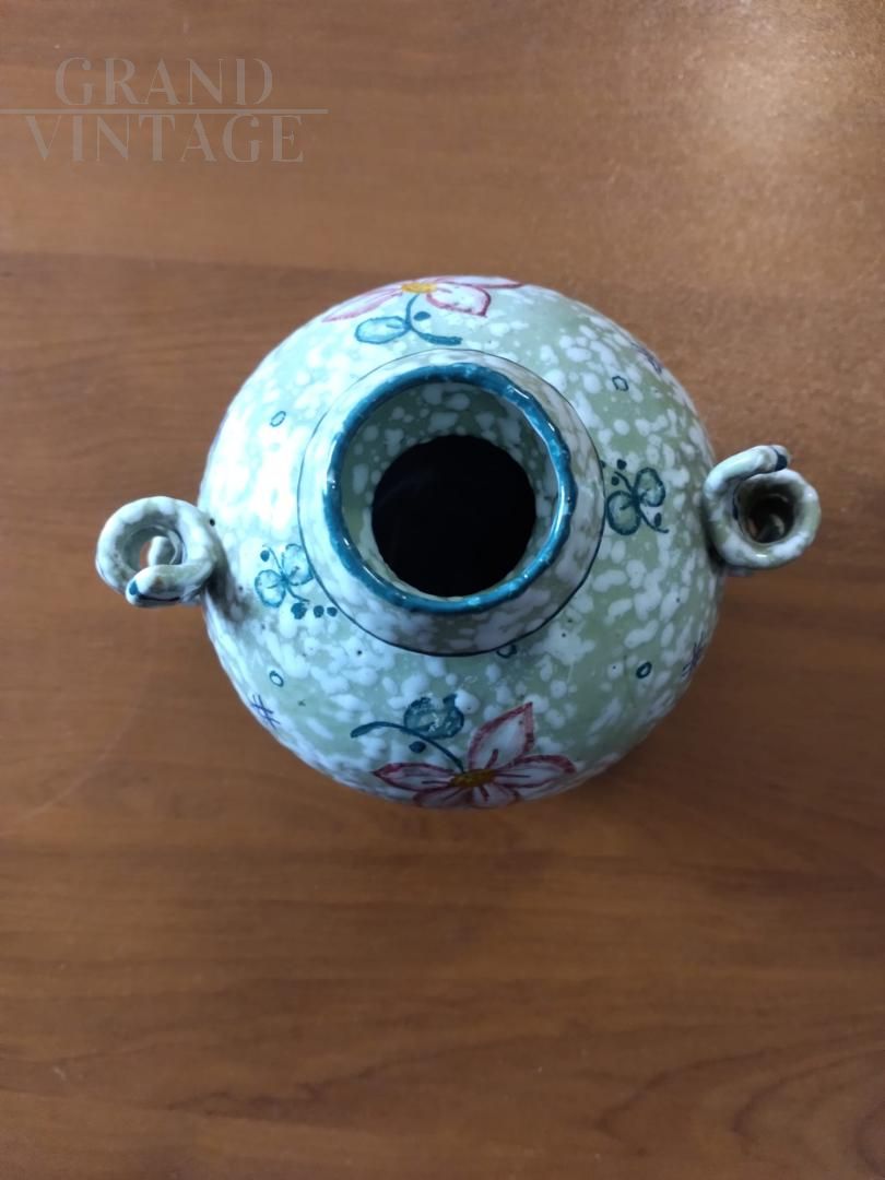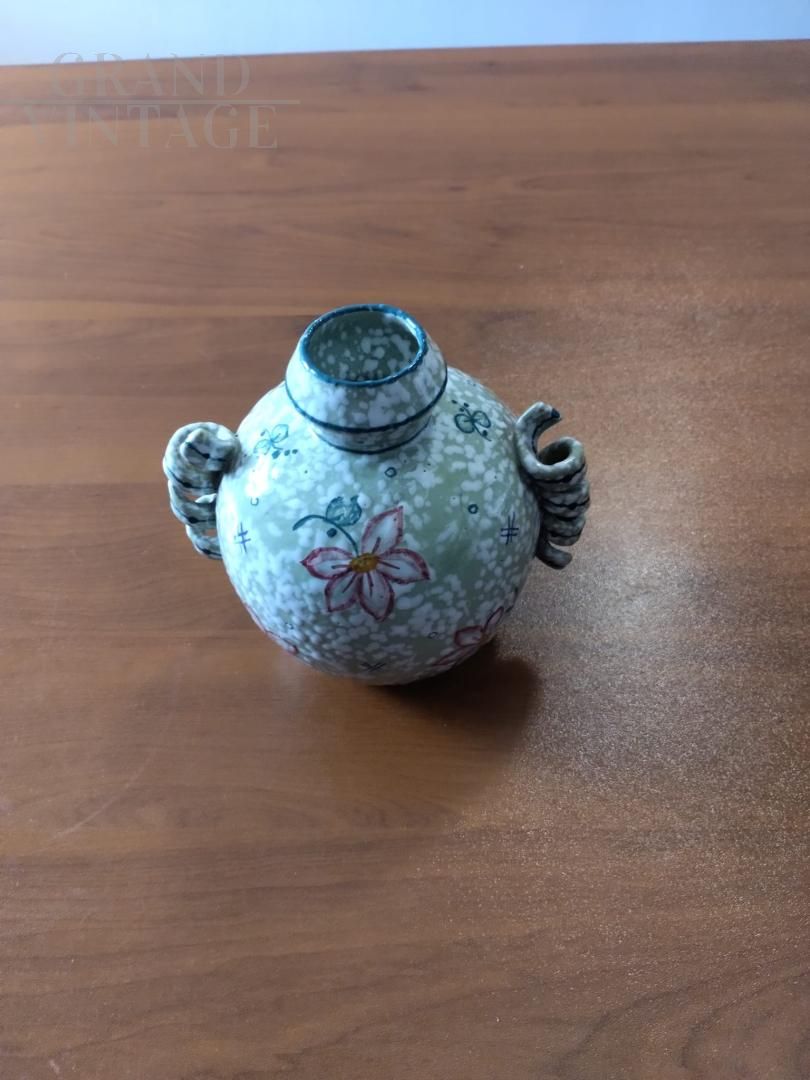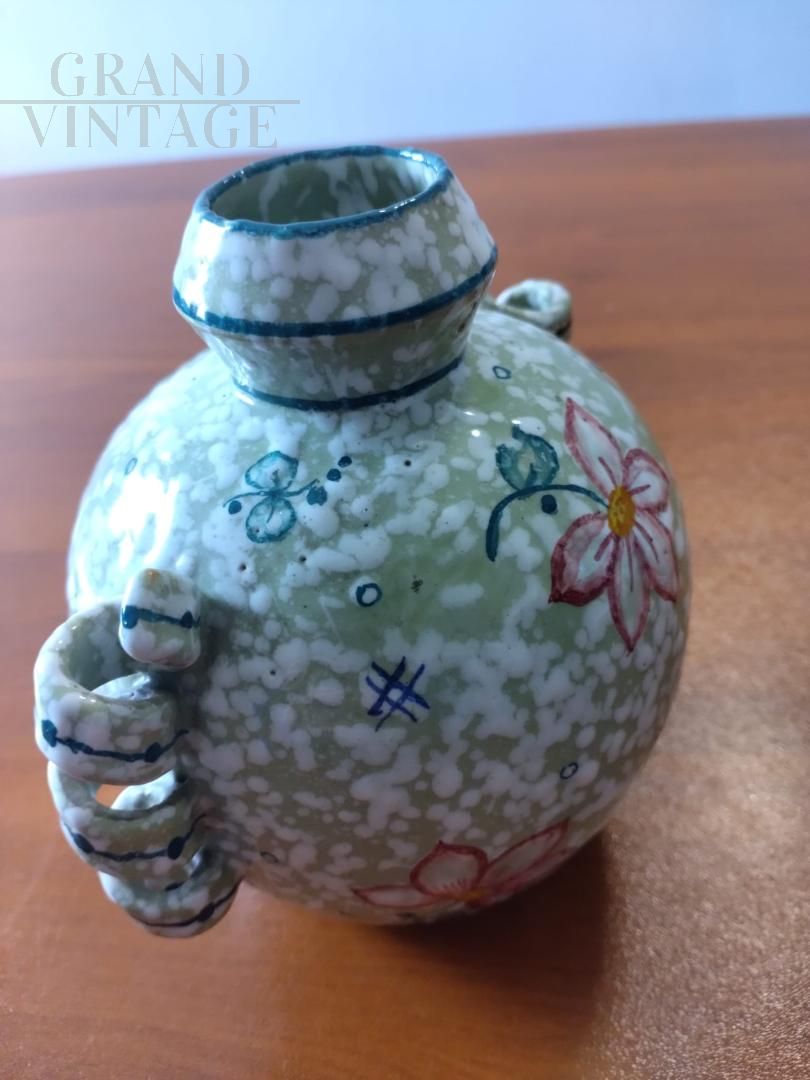 Piccolo vaso ad anfora vintage anni '40 in ceramica maiolica Deruta firmato G. Lamincia E. F., dipinto a mano e decorato da bellissimi manici a spirale. Oggetto vintage mantenuto nelle condizioni originali, potrebbe necessitare di interventi lievi di restauro. Il vaso è comunque in perfette condizioni.