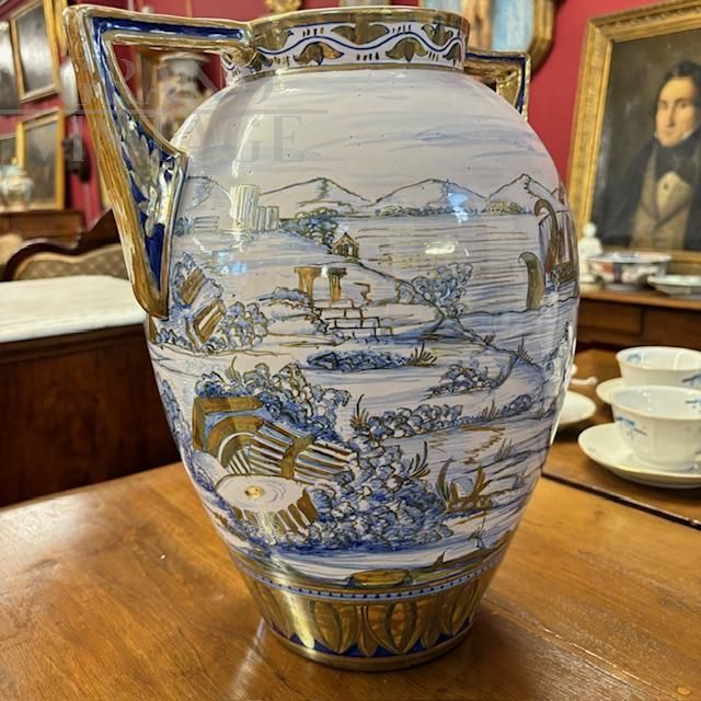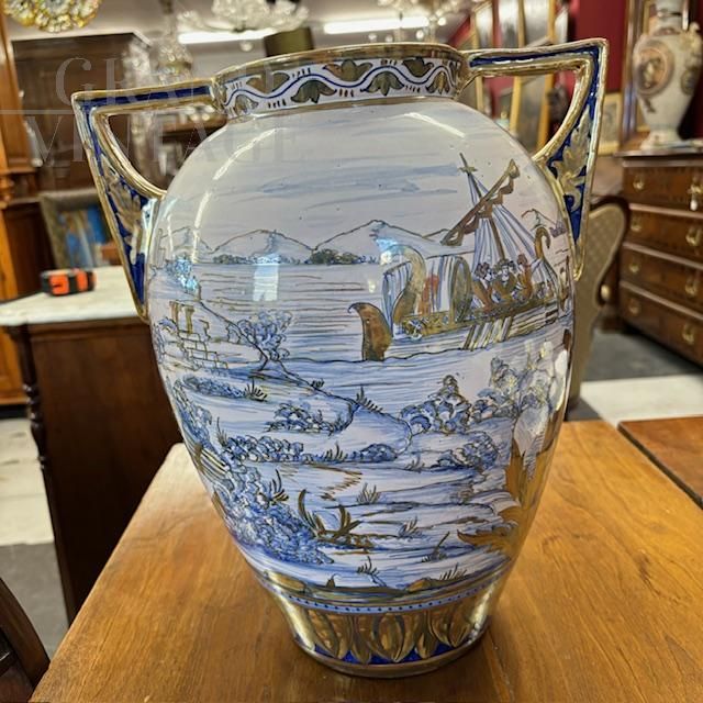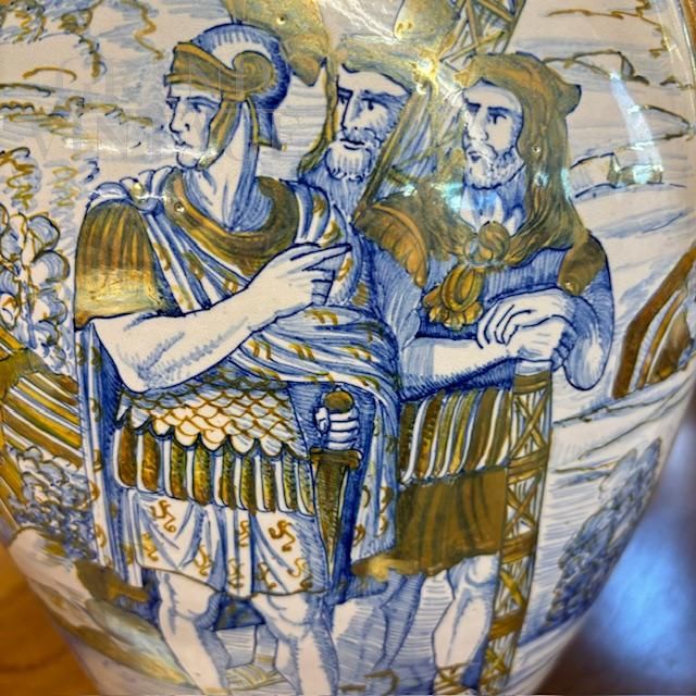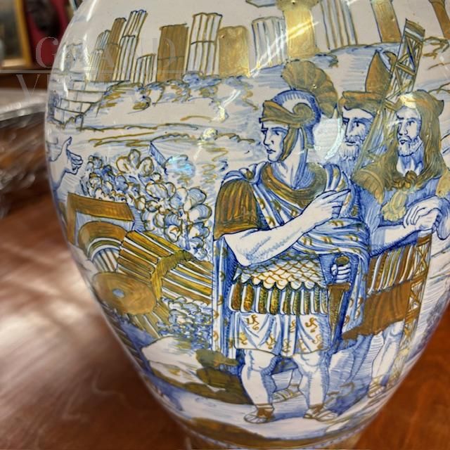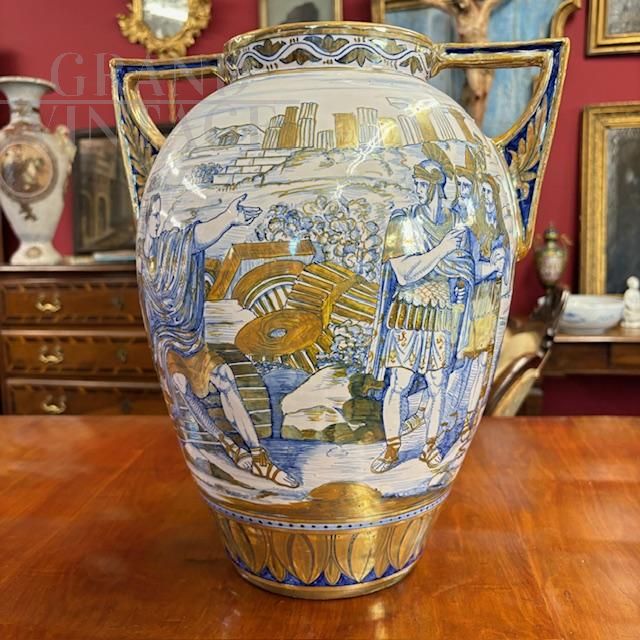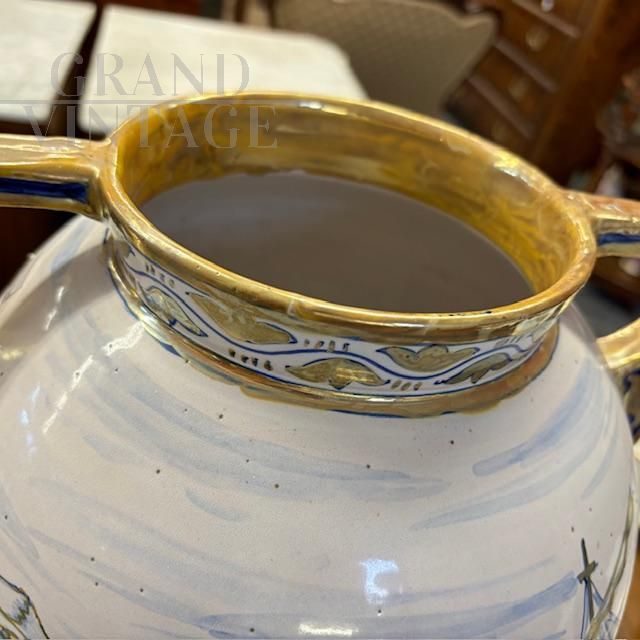 Antico splendido vaso in ceramica maiolica a lustro art déco di Gualdo Tadino, manifattura Mastro Giorgio, dipinto a mano con scena classica romana nei colori blu e oro su fondo bianco, con particolari manici a compasso, Italia anni '40. Di grandissima qualità e bellezza, il vaso è in ottimo stato, firmato alla base.