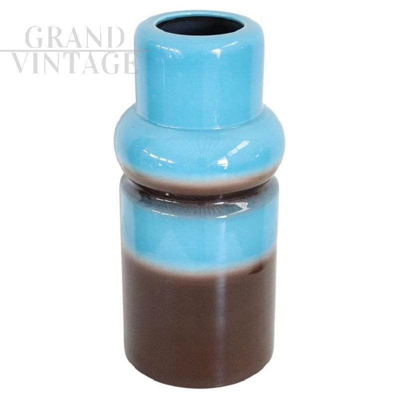 Raffinato vaso in ceramica policroma smaltata nei toni del blu e del marrone, ideale come pezzo d’arredamento per ambienti moderni e vintage.