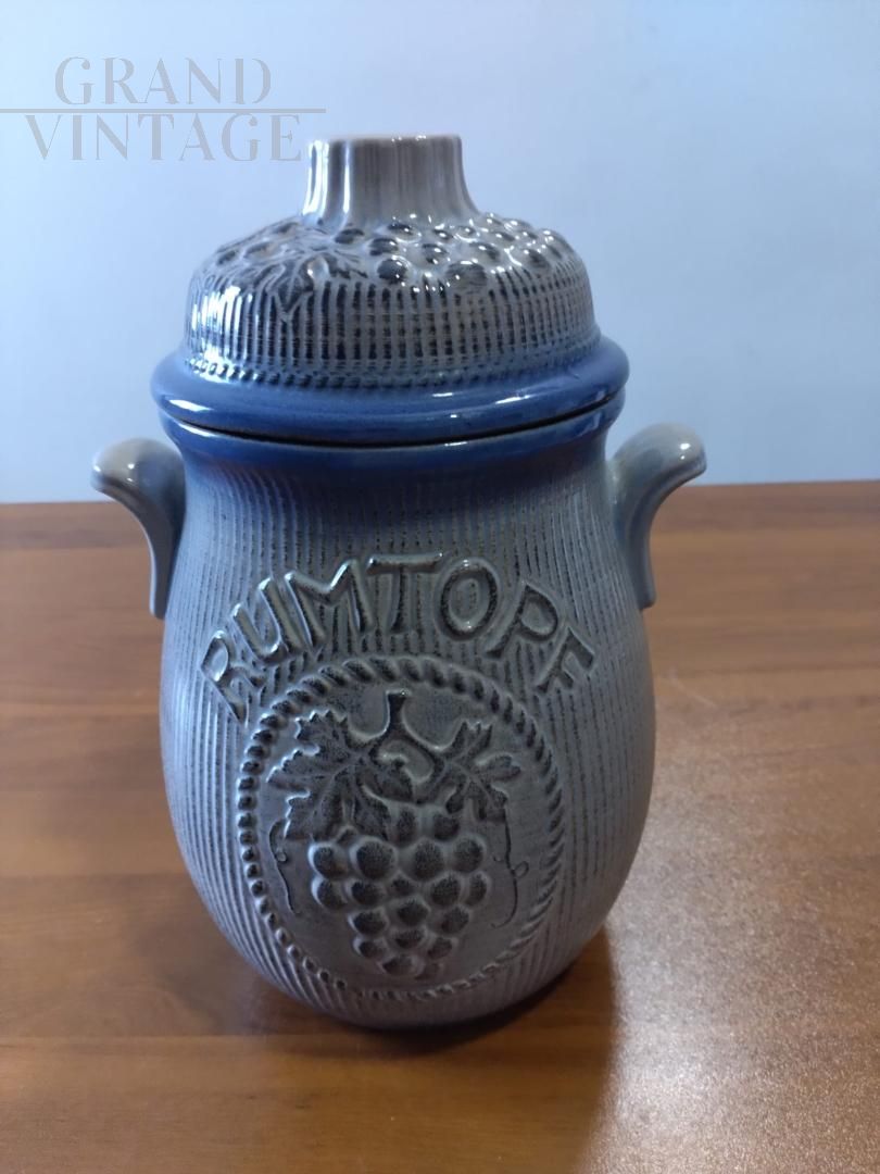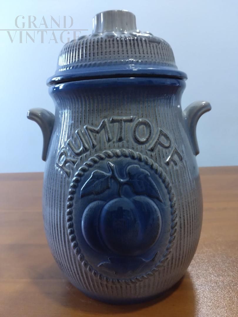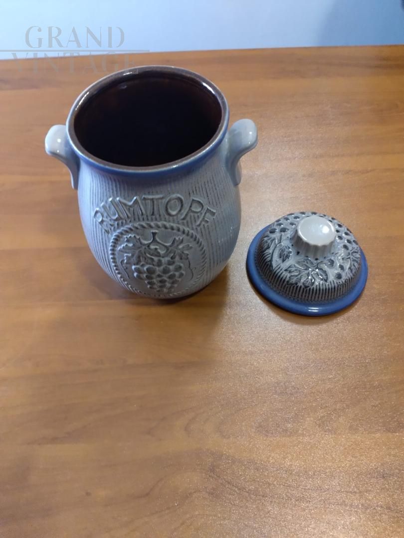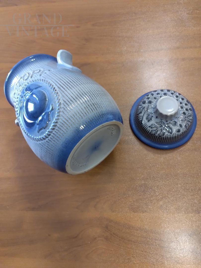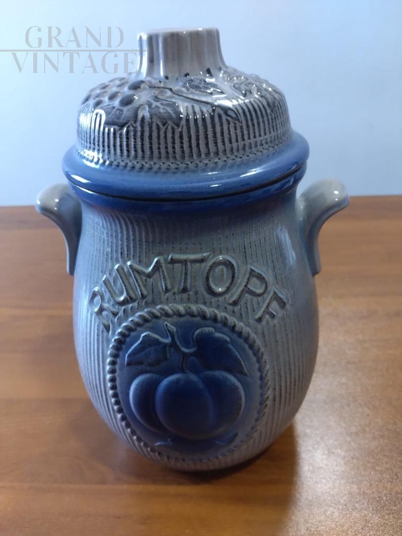 Bellissimo vaso barattolo vintage con coperchio per Rumtopf in ceramica smaltata blu con frutta in rilievo, con marchio W. Germany. Oggetto vintage proposto nelle condizioni originali, in perfette condizioni di conservazione, con lievi segni del tempo.