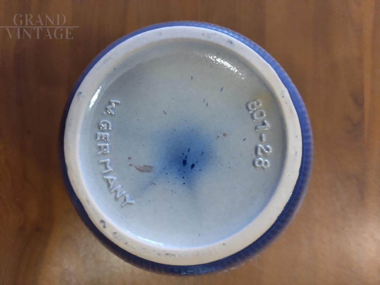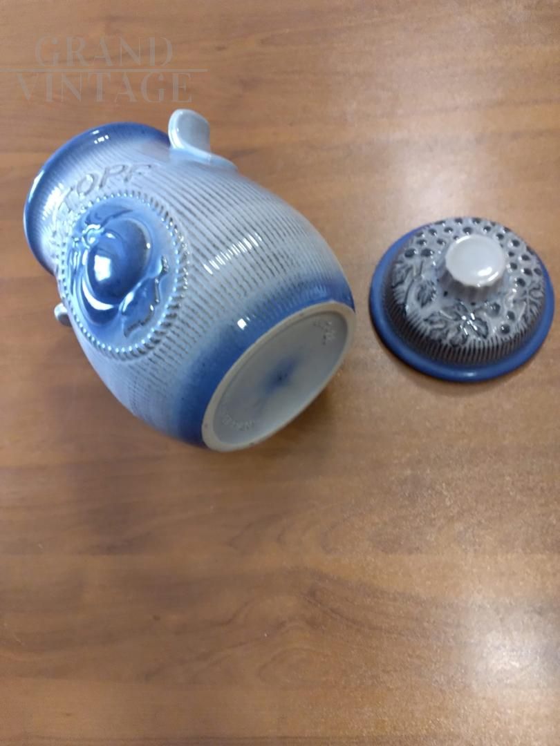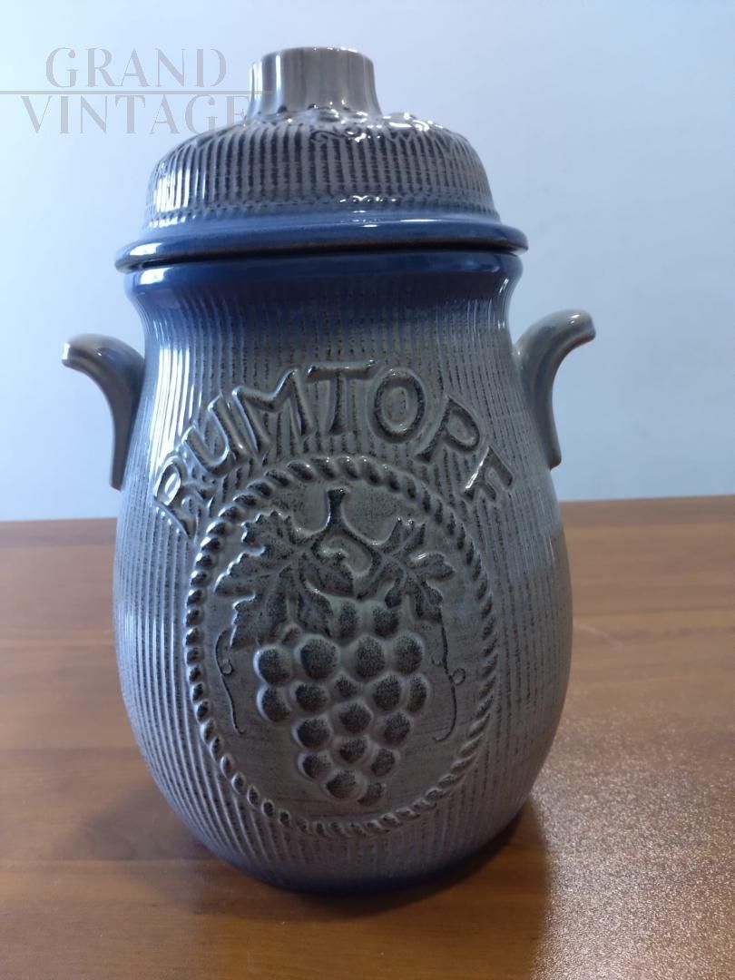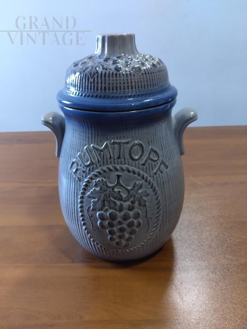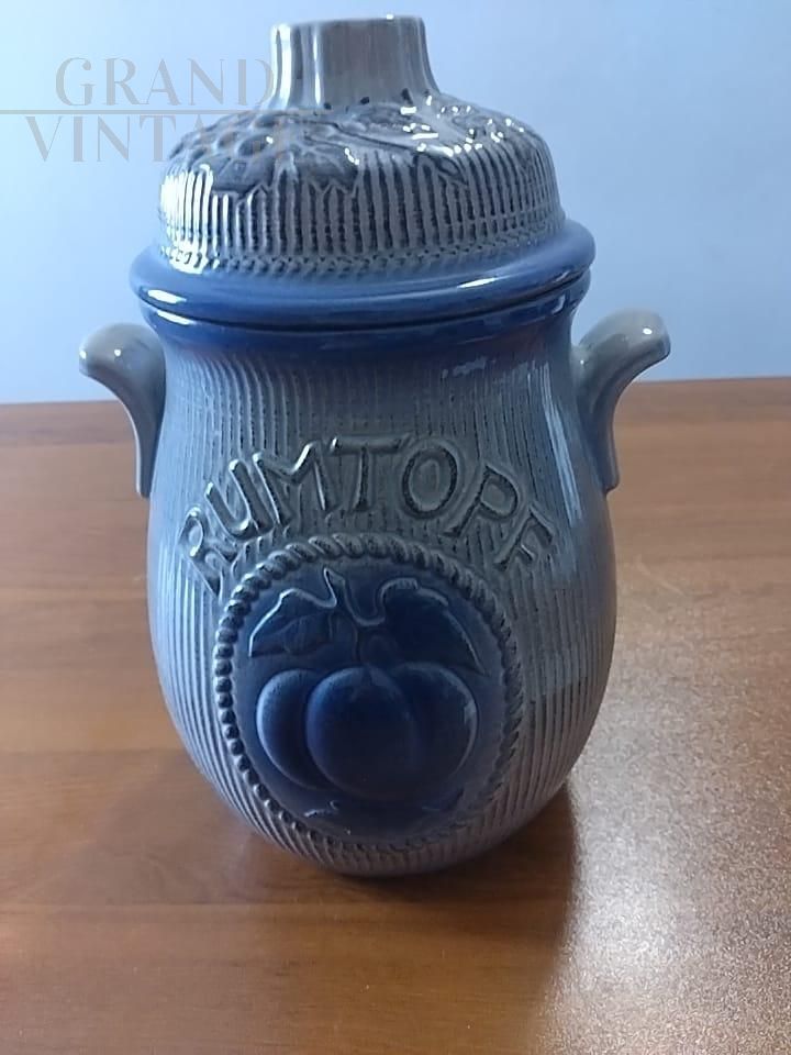 Bellissimo vaso barattolo vintage con coperchio per Rumtopf in ceramica smaltata blu con frutta in rilievo, con marchio W. Germany. Oggetto vintage proposto nelle condizioni originali, in perfette condizioni di conservazione, con lievi segni del tempo.