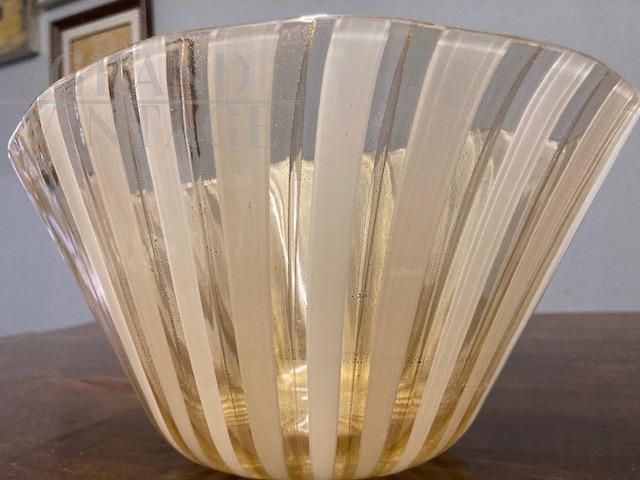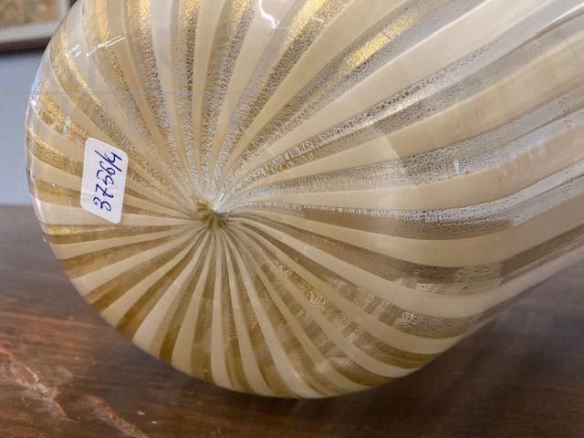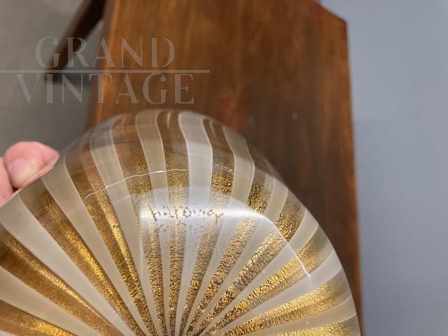 Splendido vaso centrotavola in vetro di Murano a righe color avorio e dorate con sospensione di polvere d'oro, firmato Barovier e Toso, anni '70. Oggetto firmato alla base inciso Barovier e Toso, in perfetto lo stato di conservazione.