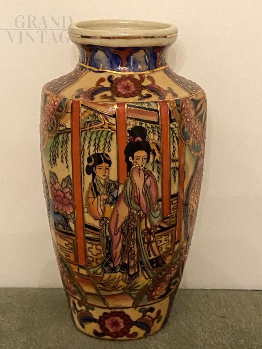 Vaso cinese con decorazione cloisonné con figure femminili, anni '50.