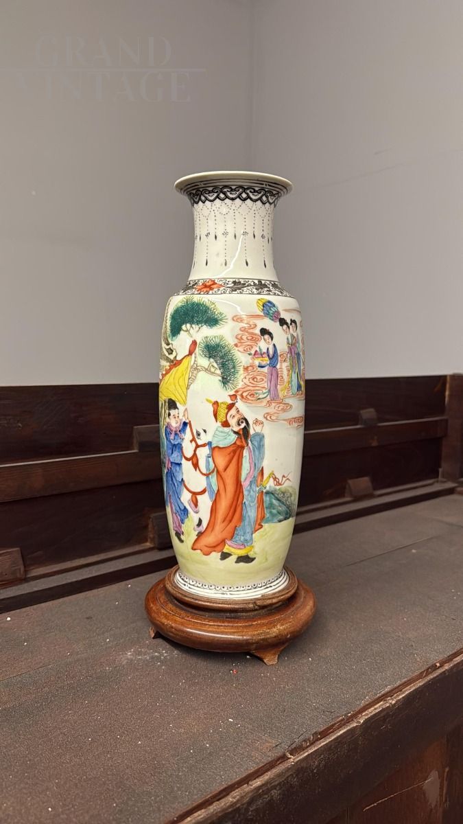 Vaso cinese in porcellana appartenente alla dinastia Qing, XX secolo, con altezza 38 cm e diametro 15 cm. La decorazione è a smalto policromo con figure umane in costumi popolari cinesi. Base in legno, buono stato di conservazione.
