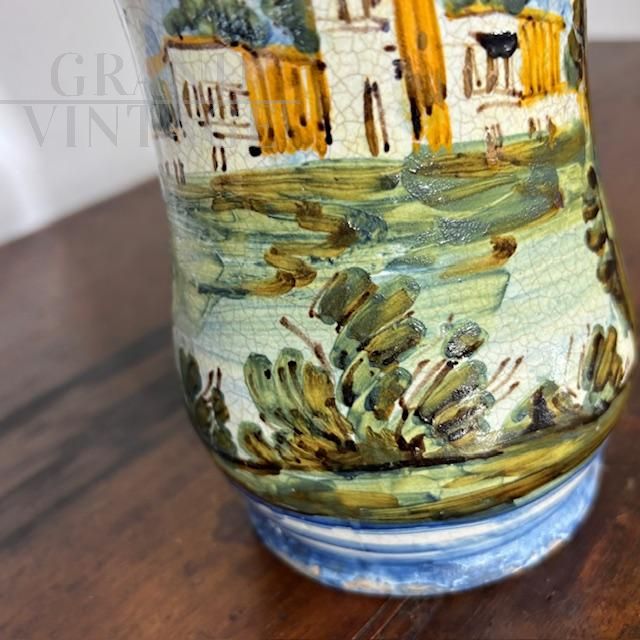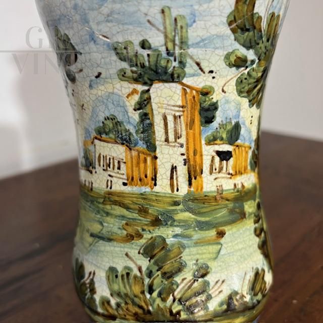 Dimensioni: altezza 20 cm, diametro 10.50 cm. Molto bello il classico decoro dipinto a mano con paesaggio e case. Presenta piccole naturali imperfezioni e filature antiche, come da foto.
