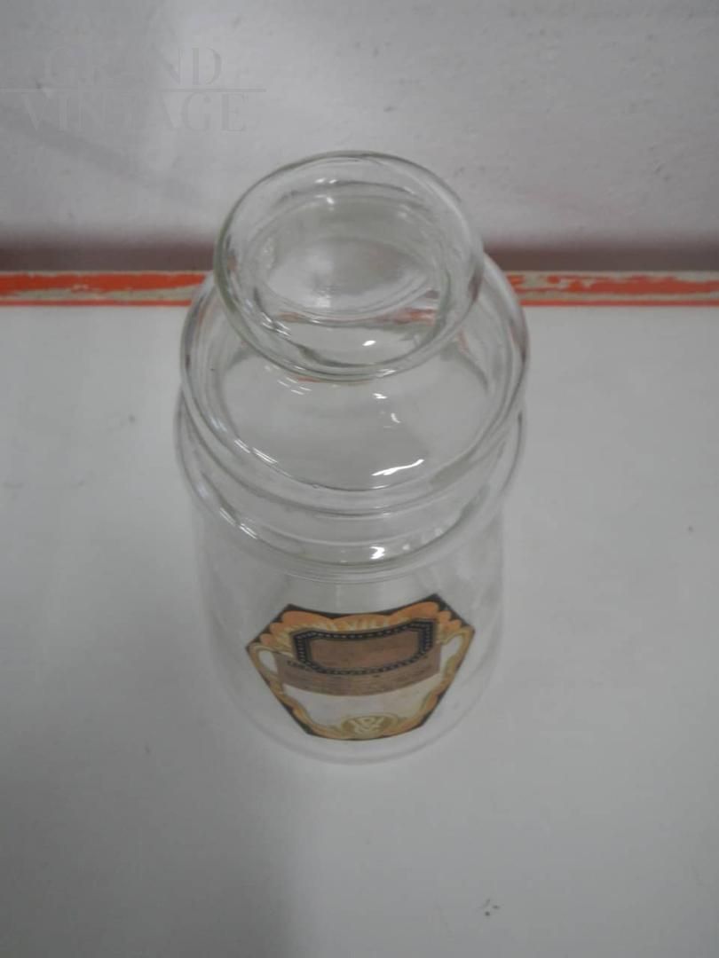 Vaso contenitore da negozio vintage in vetro con tappo in vetro ed etichetta originale. Questi vasi venivano usati nei negozi di rivendita tabacchi e giocattoli come contenitori di caramelle.