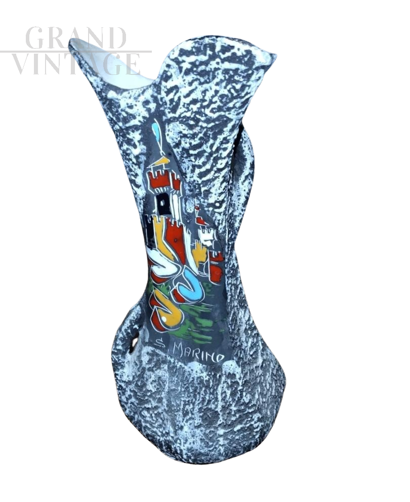 Vaso souvenir della Repubblica di San Marino in ceramica effetto lava firmato Giulianelli, con doppia decorazione artigianale a smalti di scorcio di paese e motivo vegetale, realizzato negli anni '60. A base rotonda.