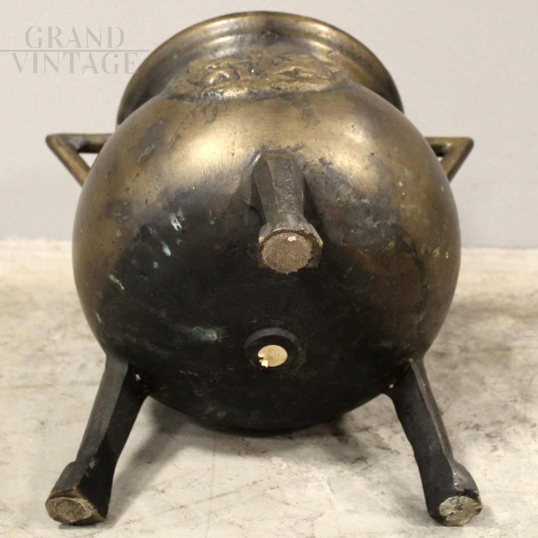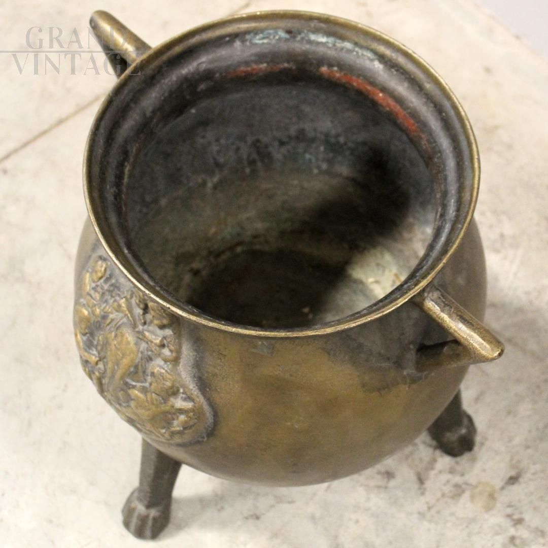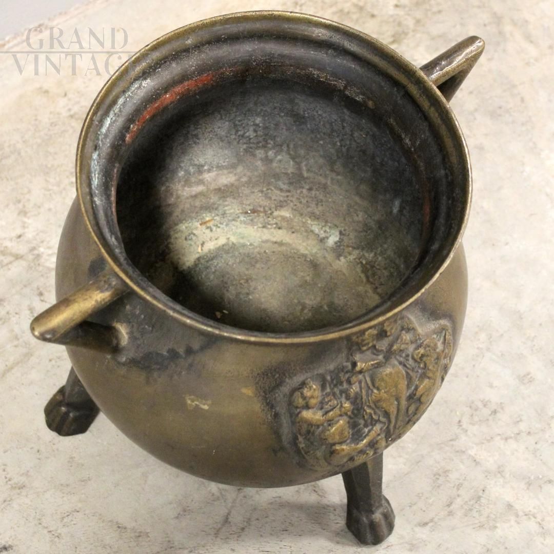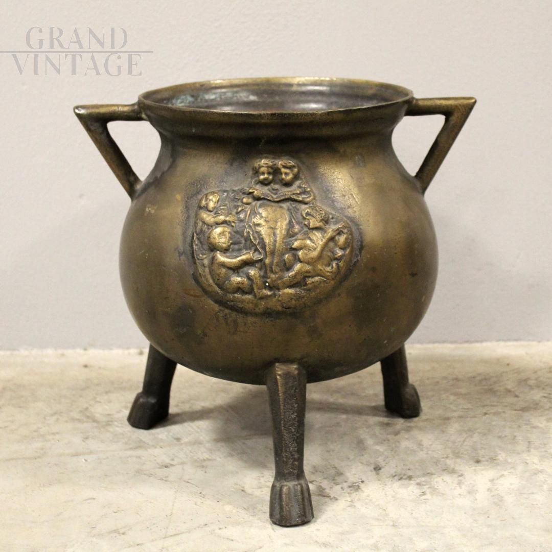 Vaso in bronzo antico poggiante su tre piedi, decorato con figure di cherubini, Italia '800.