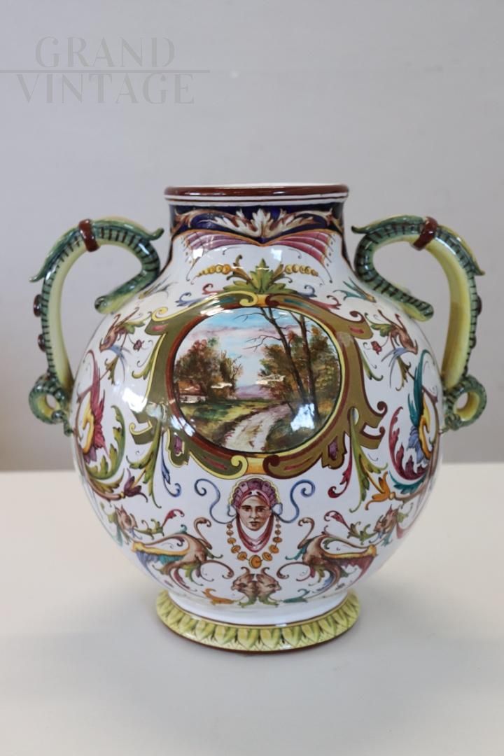 Splendido vaso realizzato a Faenza, in Italia, e risalente agli anni Cinquanta. Il vaso è realizzato in ceramica smaltata policroma. L'accattivante decorazione dipinta in stile classico che adorna ogni lato di questo vaso cattura sicuramente l'attenzione. Un lato presenta il ritratto di una giovane donna al centro, mentre l'altro presenta un bellissimo paesaggio. Il vaso reca sul fondo i marchi Cacf Faenza e I Fabbri; questo marchio identifica il lavoro del ceramista Ilario Fabbri come "Cooperativa Artigiana Ceramisti Faentini", una cooperativa di artisti della ceramica fondata nel 1945. Questo grande ed elegante vaso sarebbe un'aggiunta ideale al tavolo d'ingresso, al soggiorno o alla sala da pranzo. Prezzo trattabile.