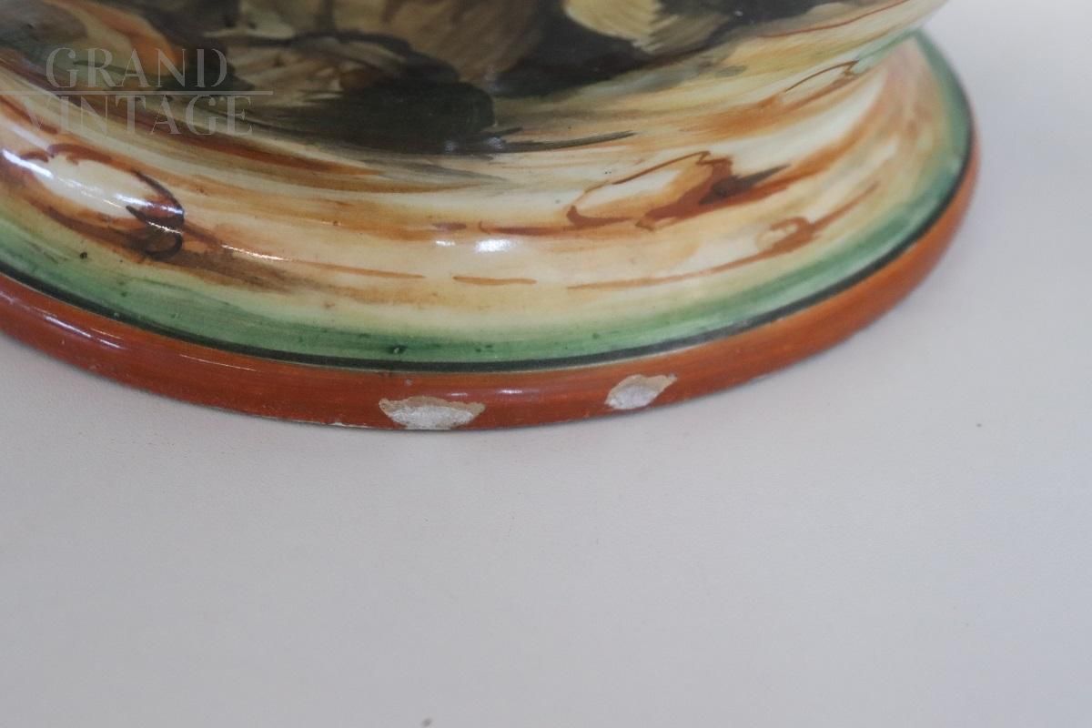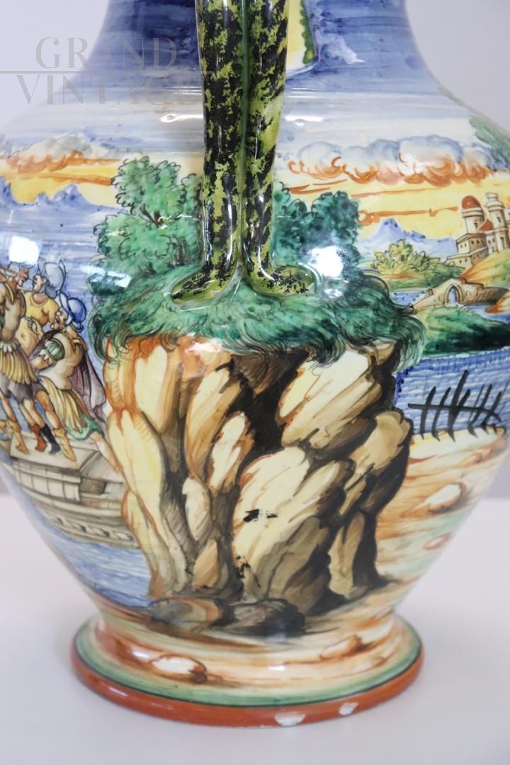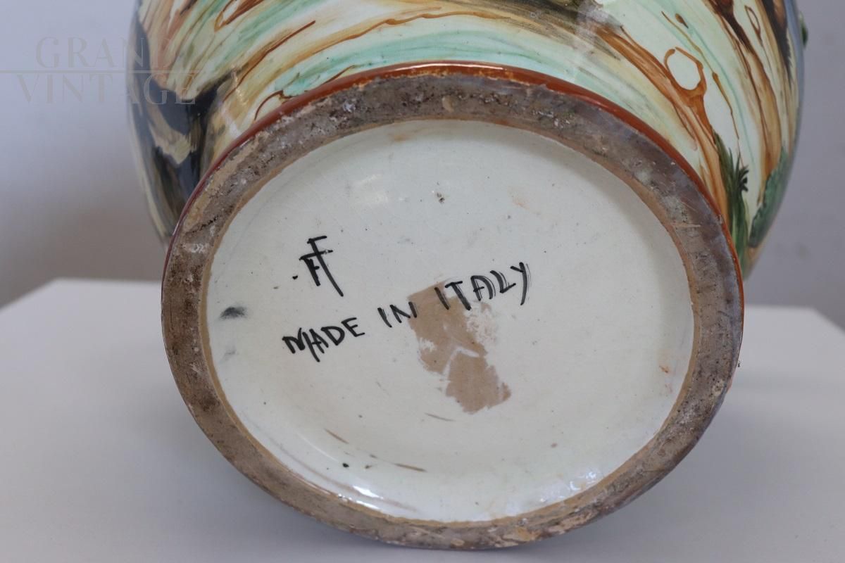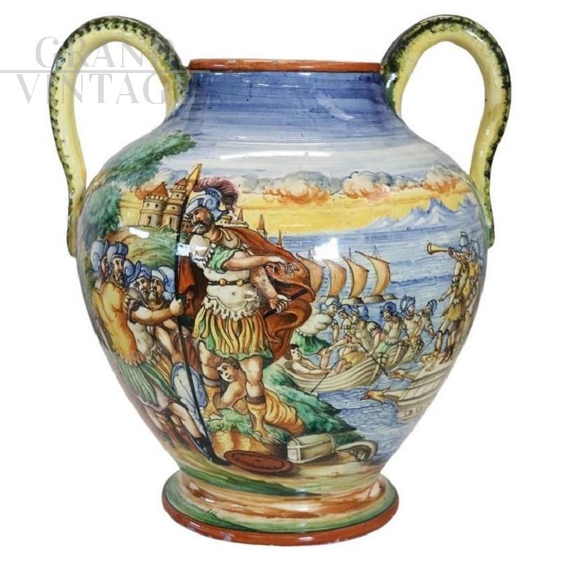 Vi presentiamo questo fantastico vaso produzione italiana zona fiorentina, risalente agli anni '80. Il vaso è realizzato in ceramica smaltata policroma. L'accattivante decorazione in stile classico che decora ogni lato di questo vaso catturerà sicuramente l'attenzione dei vostri ospiti. Valorosi guerrieri, paesaggi marini, velieri e una vegetazione lussureggiante rendono questo vaso un elemento decorativo accattivante e unico per la vostra casa. Il vaso presenta marchio FF sotto la base e Made in Italy. Marchio riconducibile alla manifattura "Ceramiche Artistiche F.lli Fanciullacci", fondata a Montelupo Fiorentino da Raffaello Fanciullacci. La base presenta due piccoli difetti; si prega di vedere le foto per i dettagli. Ciò non compromette la stabilità e l'estetica complessiva.