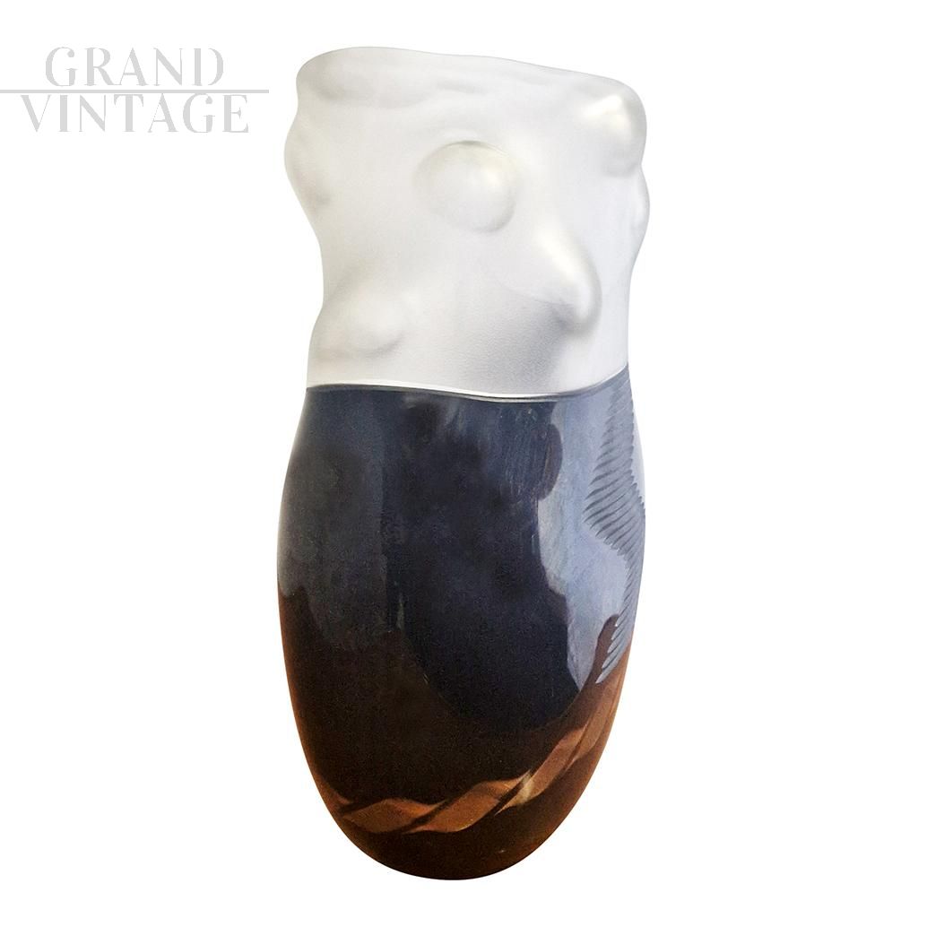 Bellissimo vaso artistico di Murano Colizza in vetro soffiato nei toni del bianco e del nero con forti contrasti tra le parti satinate, le parti lucide e i giochi di intrecci. Il vaso è firmato, è stato realizzato artigianalmente dai maestri vetrai all'interno delle fornaci di Murano con un processo di lavorazione a caldo. La forma e lo spessore particolari lo rendono un elegante e particolare oggetto di arredo.