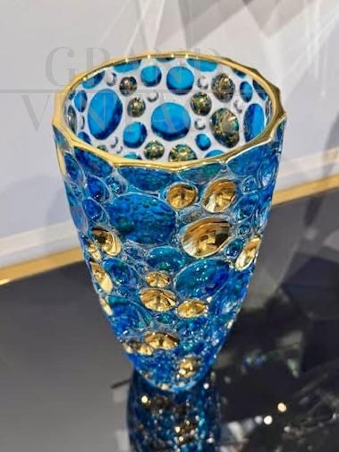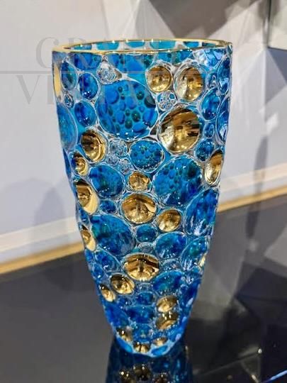 Vaso in vetro di Murano dipinto a mano con inserti in oro zecchino 24 Kt lavorato dai maestri muranesi. Vaso di incredibile lucentezza grazie alla trasparenza e luminosità del colore turchese e dato l'impiego della foglia oro 24 KT . Il vaso misura cm 35,5 x diametro 15cm.