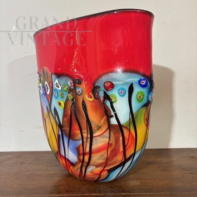 Strepitoso vaso artistico in vetro di Murano multi colore con lavorazione incamiciata e a Murrine Millefiori, di grandi dimensioni! Italia anni '70.