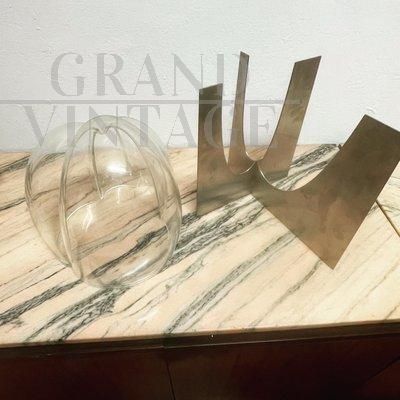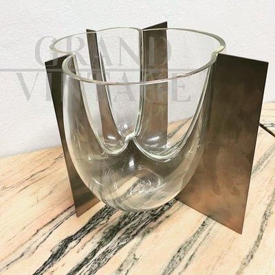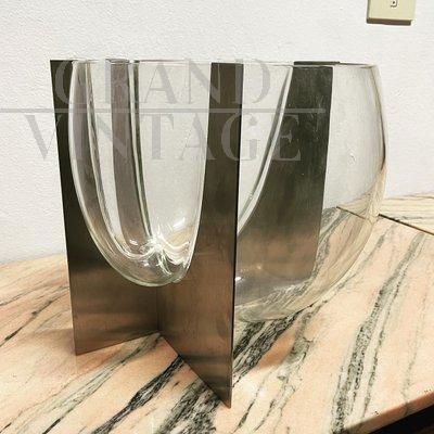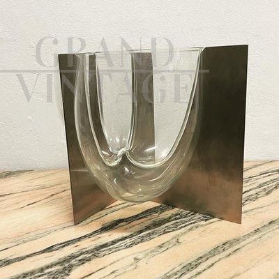 Vaso scultura S509 di Carlo Nason per Mazzega in vetro di Murano incastonato in lastre di acciaio, oggetto sculturalmente sbalorditivo del 1969 circa. Le belle linee rotonde del vetro completano i bordi più dritti dell'acciaio inossidabile. Perfetto come superbo centrotavola o come decorazione da sfoggiare su una consolle o un tavolo.