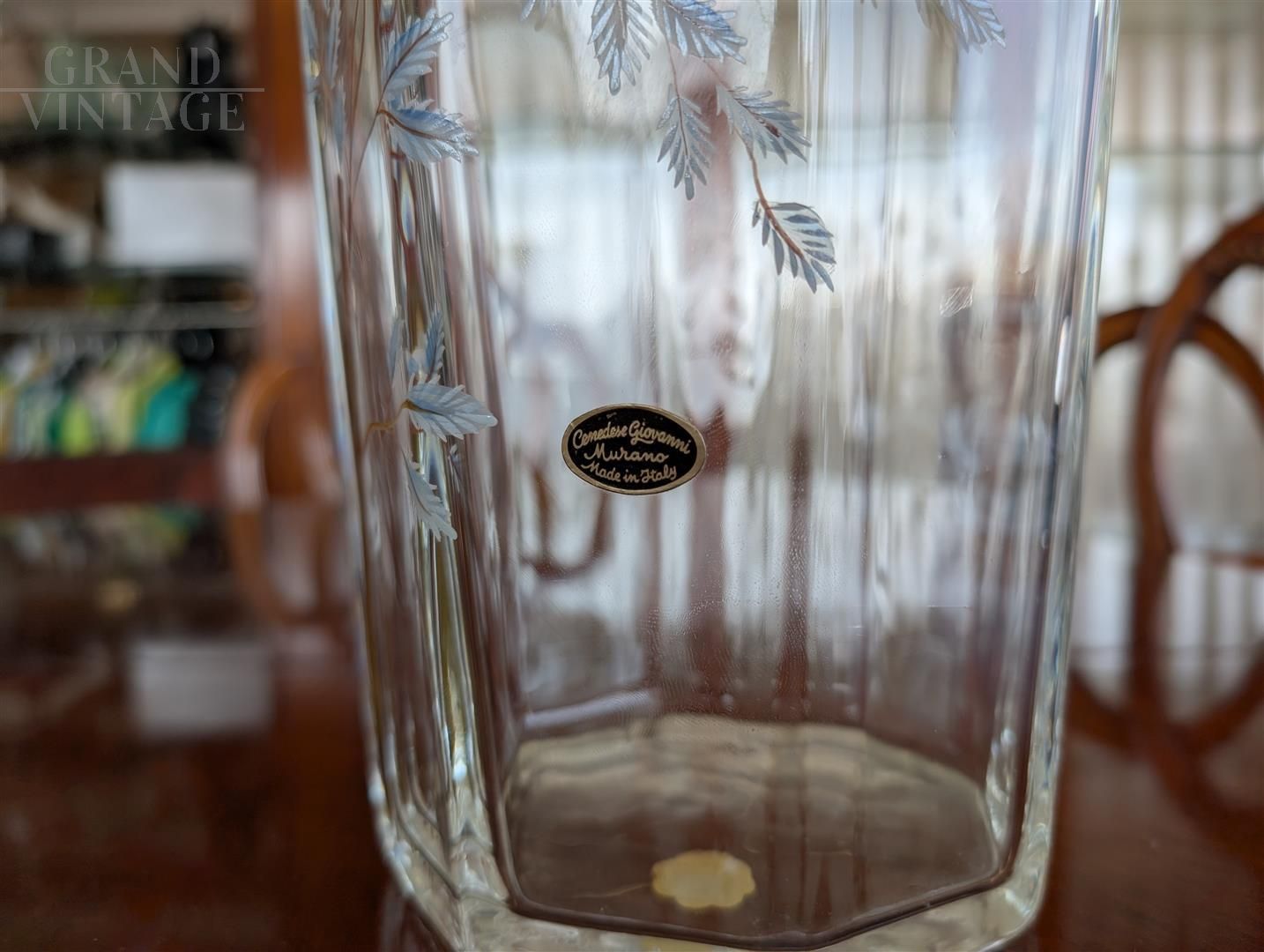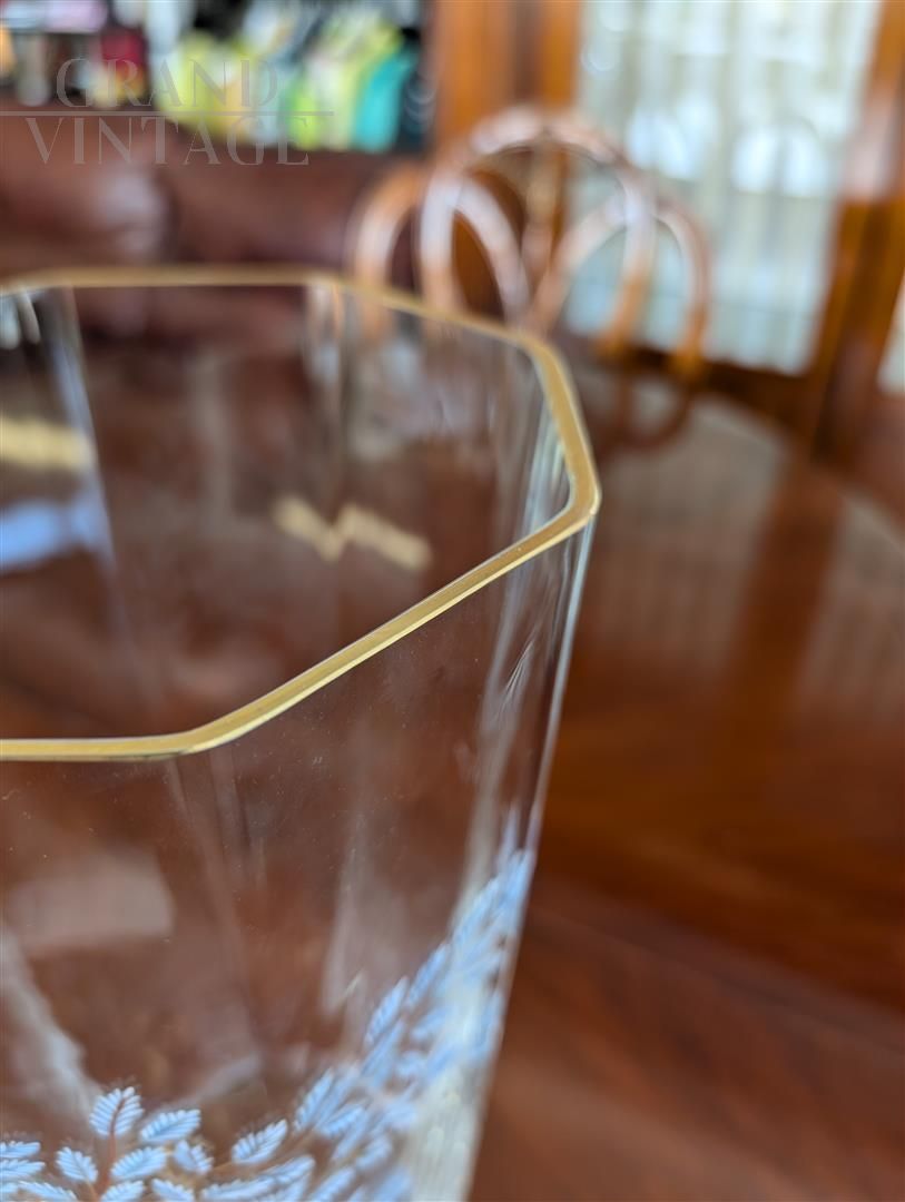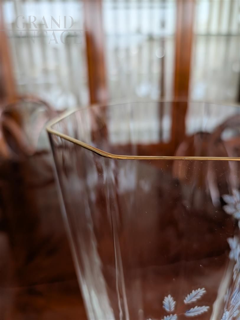 Splendido vaso in vetro di Murano firmato Giovanni Cenedese sia ad incisione che sotto il fondo, decorato da motivi di rami e foglie. In perfetto stato di conservazione, piccolissimi segni del tempo dovuti a vari spostamenti.