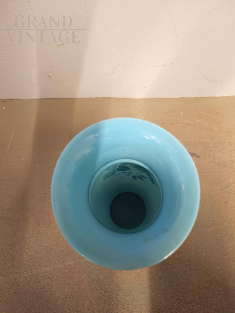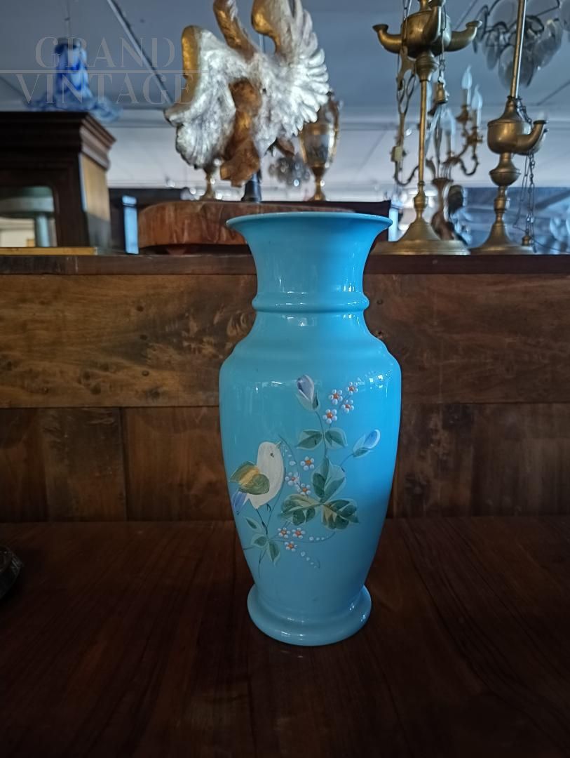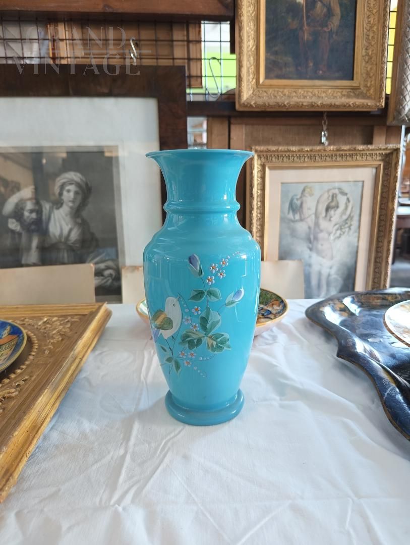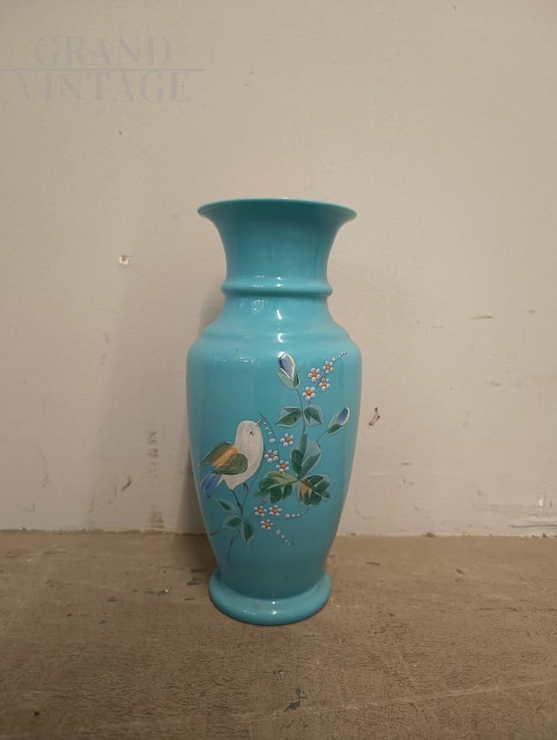 Vaso vintage art nouveau francese degli anni '30 in vetro opalino color azzurro turchese dipinto a mano con fiori e uccelli, in ottimo stato.