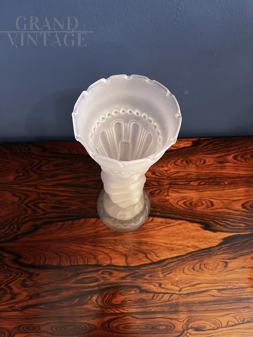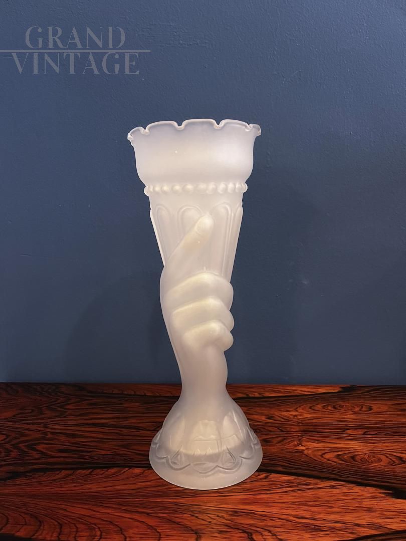 Vaso liberty in vetro satinato con mano che regge cornucopia, Francia anni '30