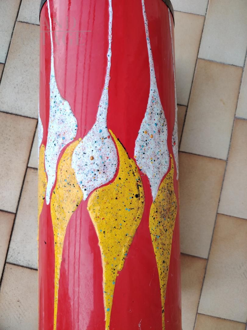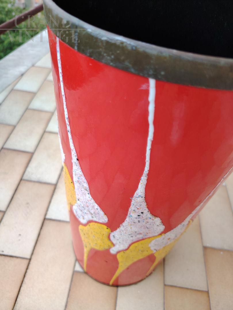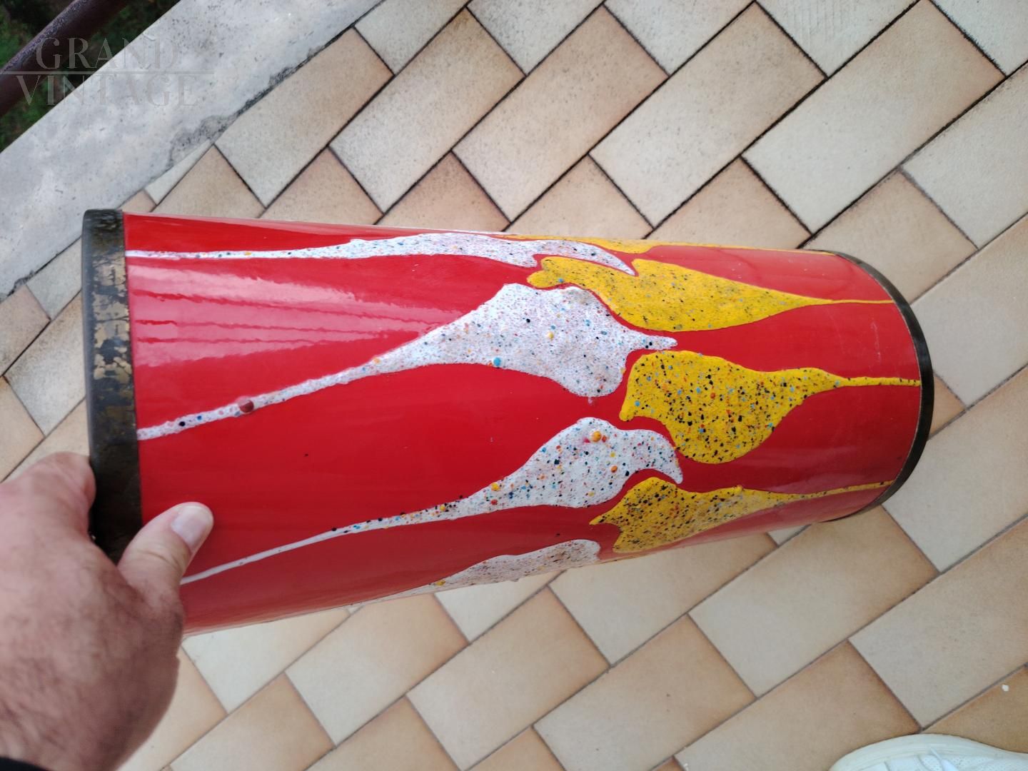 Vaso portaombrelli o porta bastoni di SIVA Poggibonsi in metallo smaltato rosso con decori in rilievo bianchi e gialli, unisce utilità ed estetica.