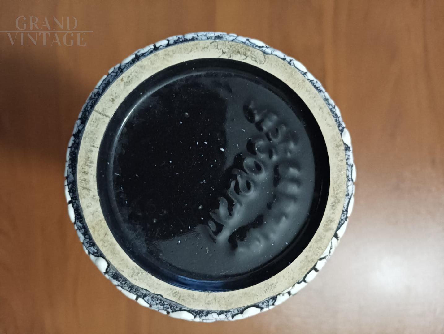 Bellissimo vaso tedesco di Jasba Keramik modello Cortina, prodotto a metà secolo in ceramica bianca e nera smaltata a crepe con effetto craquelé. L'interno del vaso è completamente smaltato di nero. I marchi alla base leggono " W. Germania" e un numero di modello 302/27. La piccola macchia di colore nero che si vede in foto è un difetto di fabbrica.