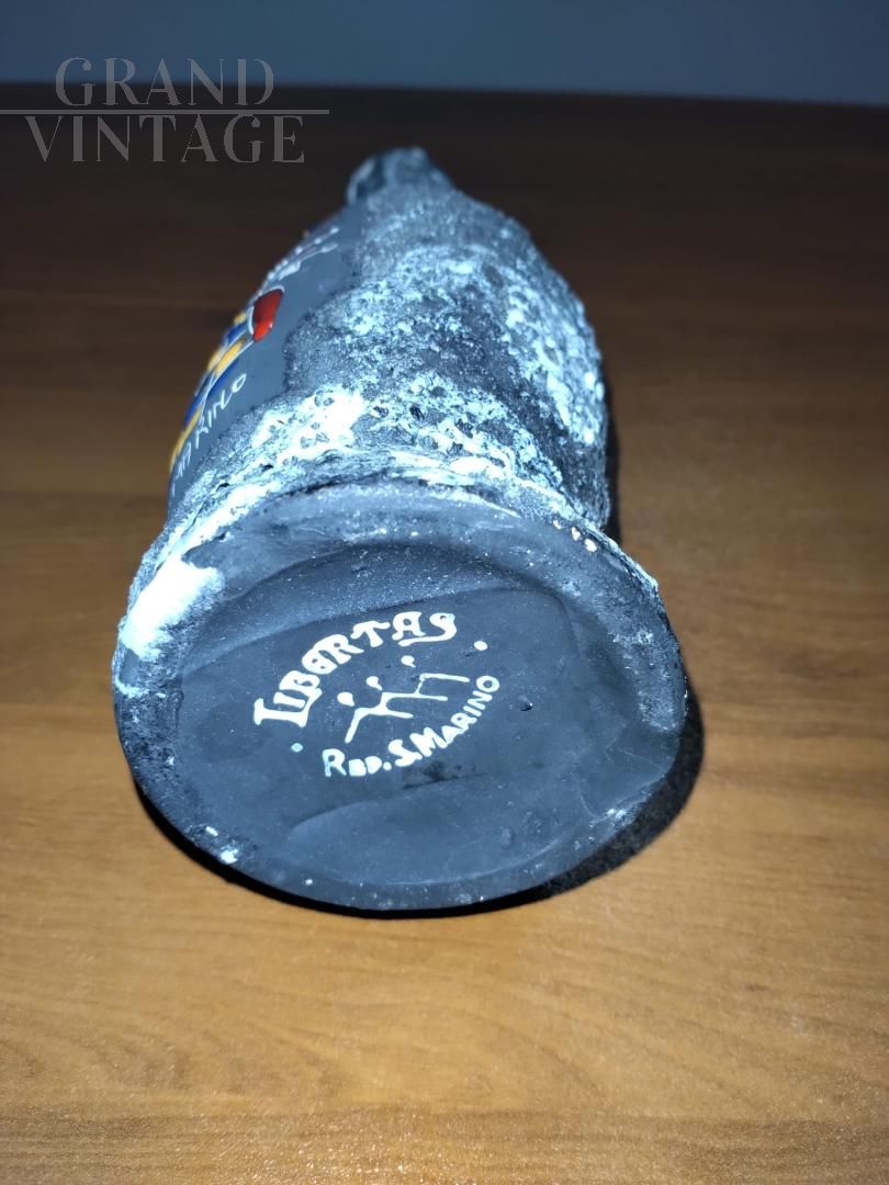 Vaso in ceramica effetto lava firmato Libertas Repubblica di San Marino, con scorcio di paese smaltato decorato a mano, un bel souvenir realizzato negli anni '50 - '60 con base rotonda.