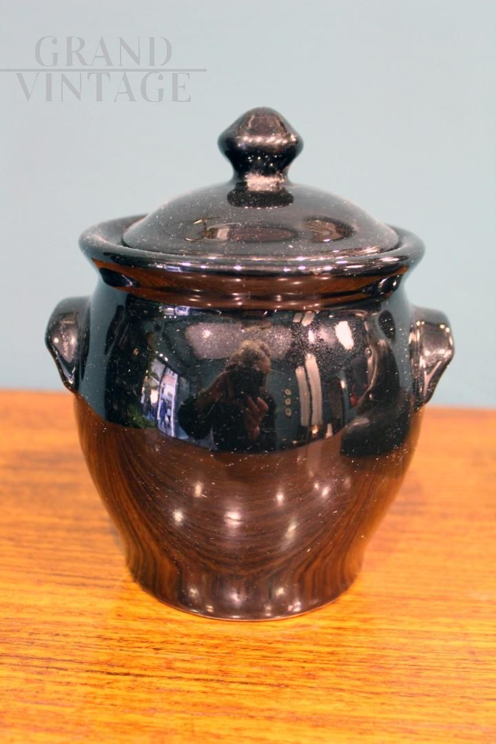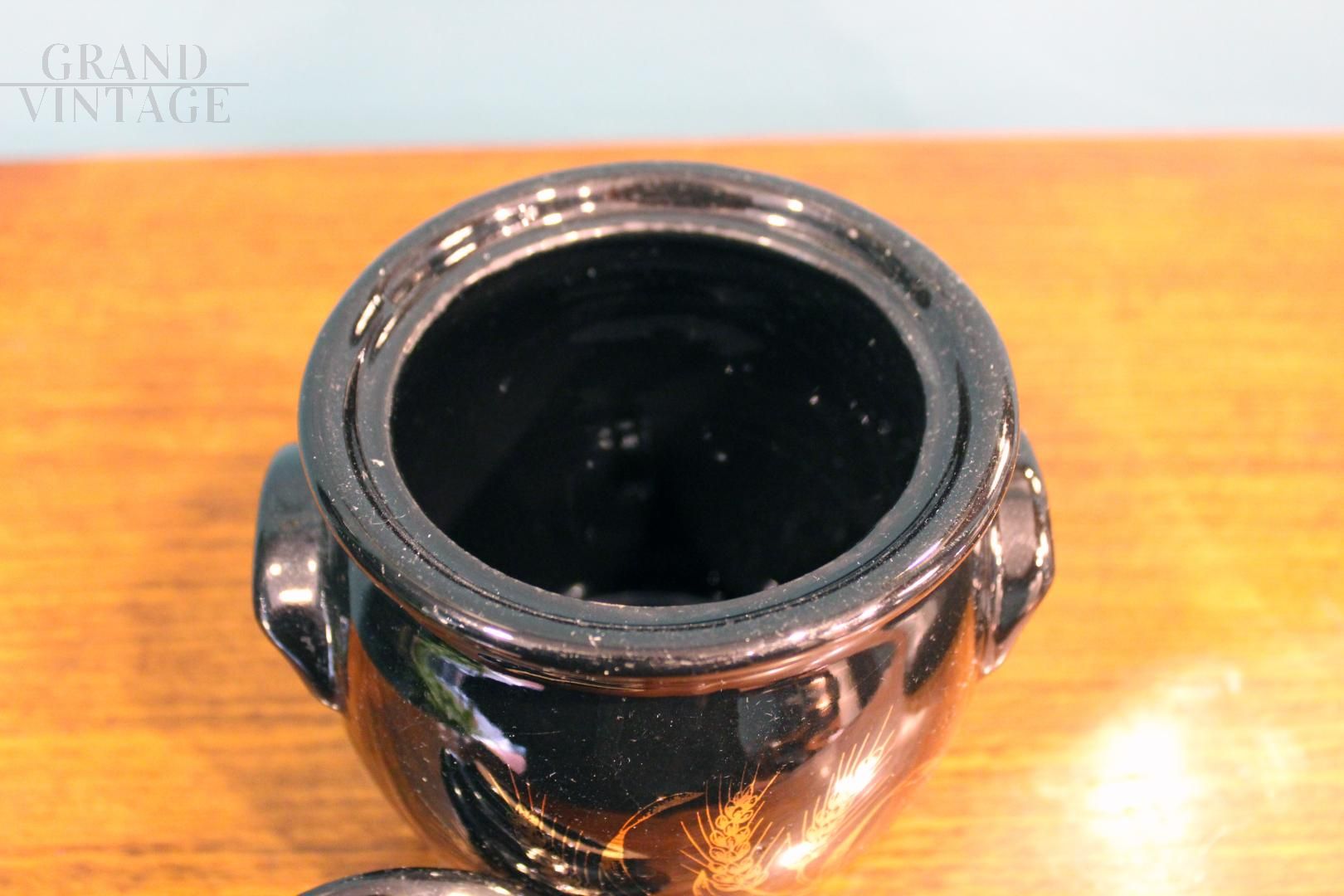 Vaso contenitore vintage in ceramica nera con decoro a spighe dorate e con coperchio, Francia anni '70, in ottimo stato di conservazione.
