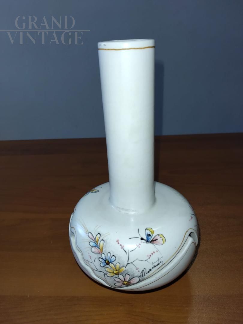Piccolo ma bellissimo vaso vintage in ceramica policroma dipinto a mano firmato Deruta Mordenti, autografato dall'artista. La decorazione consiste in fiori e farfalle. Oggetto di gusto gradevole da inserire in qualsiasi ambiente della propria casa.