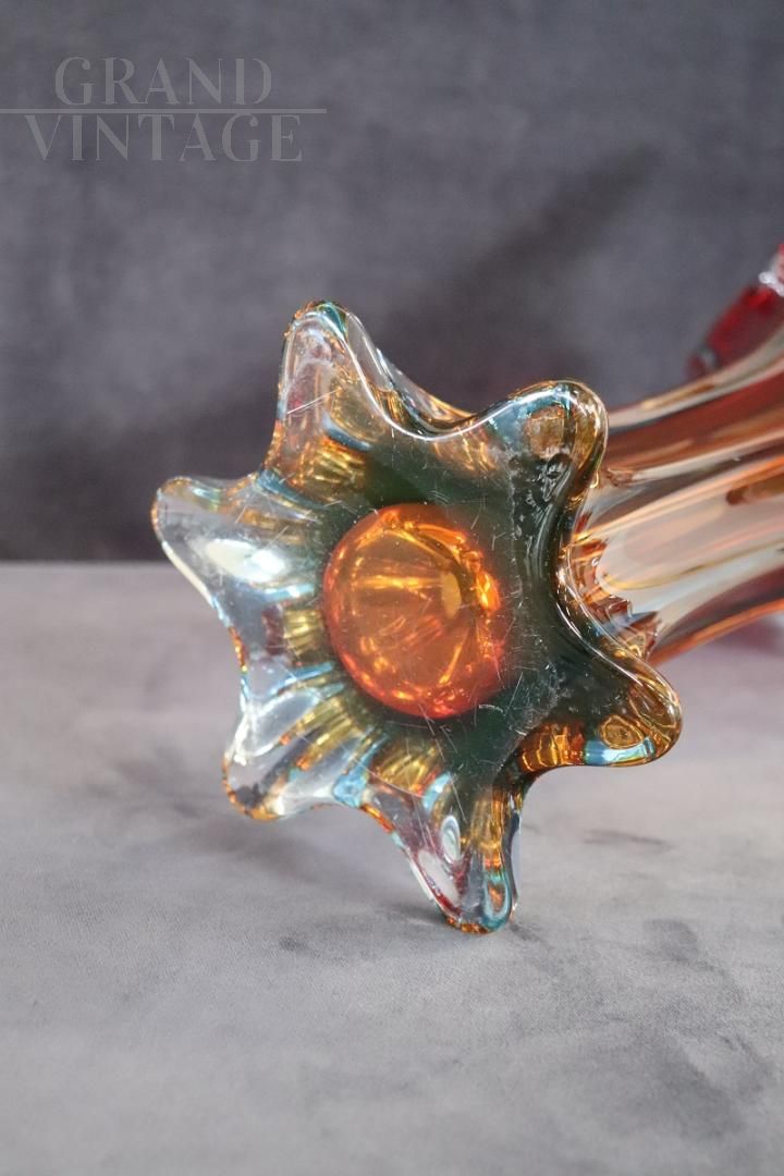 Raffinato vaso italiano in vetro artistico di Murano, anni '60 circa. Questo vaso si sviluppa in altezza ed è caratterizzato da una linea elegante e raffinata. Alta qualità artistica produzione italiana di Murano. Il vaso è realizzato con una tecnica che permette di ottenere questo unico effetto sfumato di colore che parte dall'arancione nella parte inferiore e sfuma in rosso vivo nella parte superiore. La bella combinazione di colori utilizzata crea un effetto fiamma. L'esterno è a coste. La sua particolare forma è unica, slanciata verso l'alto dove si apre come dei petali. Vaso di grande raffinatezza, dal vivo rende ancora di più la sua bellezza.