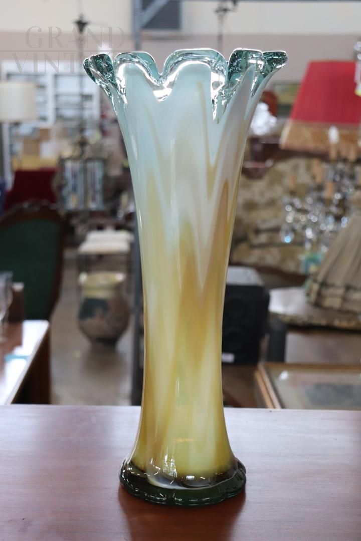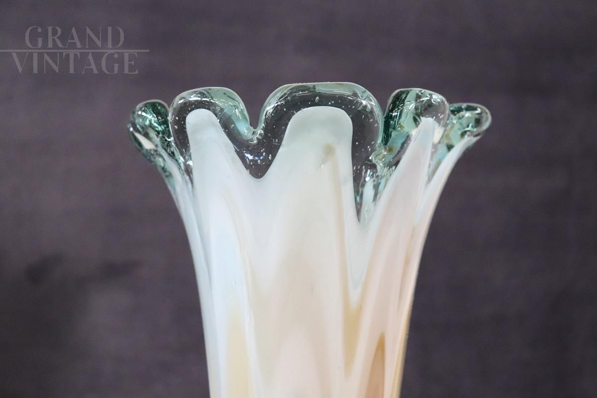 Raffinato vaso italiano in vetro artistico di Murano, anni '60 circa. Questo vaso si sviluppa in altezza ed è caratterizzato da una linea elegante e raffinata. Alta qualità artistica, produzione italiana di Murano. Il vaso è realizzato con una tecnica che permette di ottenere questo unico effetto sfumato di colore che parte da un color caramello nella parte inferiore e sfuma verso il bianco latte. Il bordo a forma di petalo nella parte superiore termina in vetro trasparente. Ottime condizioni, prezzo trattabile.