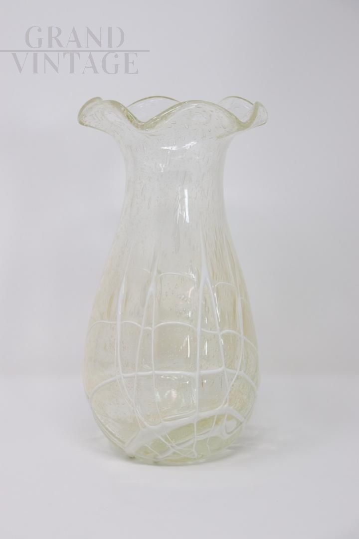 Questo particolare vaso realizzato con la tecnica del "Bullicante" è un complemento d'arredo che si distingue fortemente. Le bolle d'aria interne lasciate volutamente e tipiche di questa tecnica di lavorazione aggiungono un tocco unico e affascinante al design del vaso. Il motivo a reticolo creato dai cordoncini di vetro bianco latte in esterno non solo impreziosisce l'aspetto complessivo, ma esalta anche la trasparenza del vetro creando un contrasto accattivante. L'uso versatile del vaso come centrotavola per bouquet floreali o come oggetto decorativo dimostra la sua funzionalità, oltre alla sua bellezza estetica. Buone condizioni, prezzo trattabile.