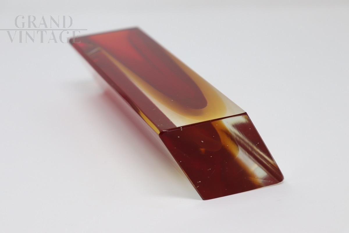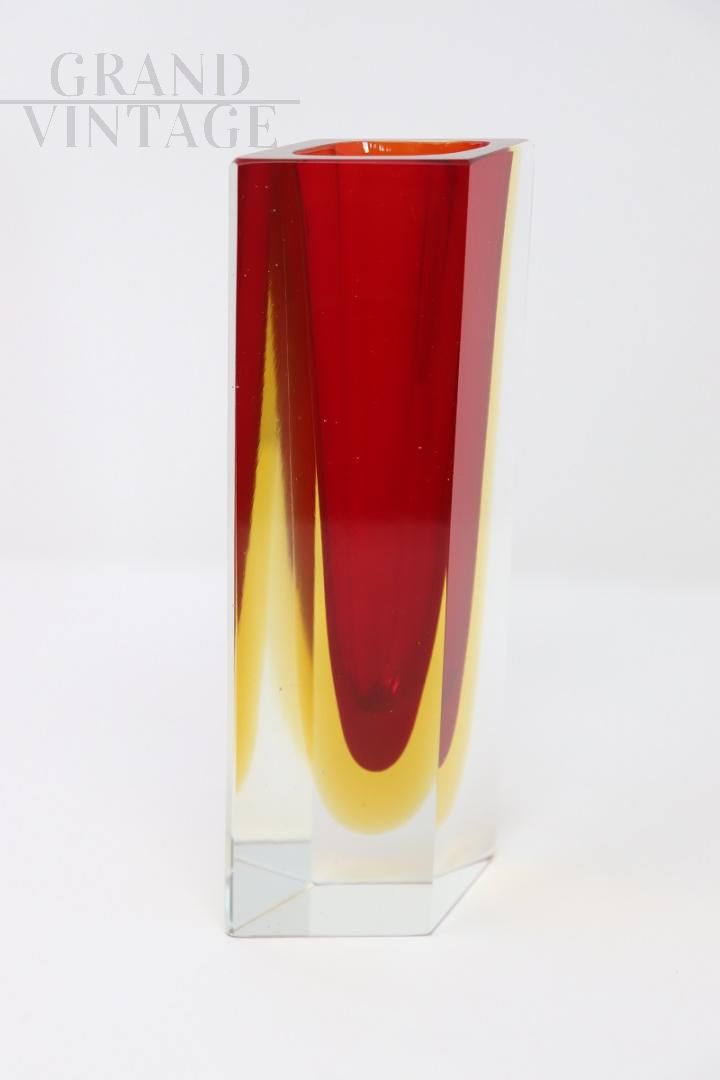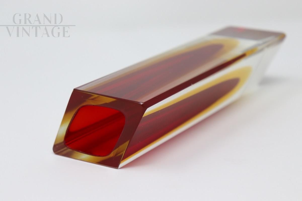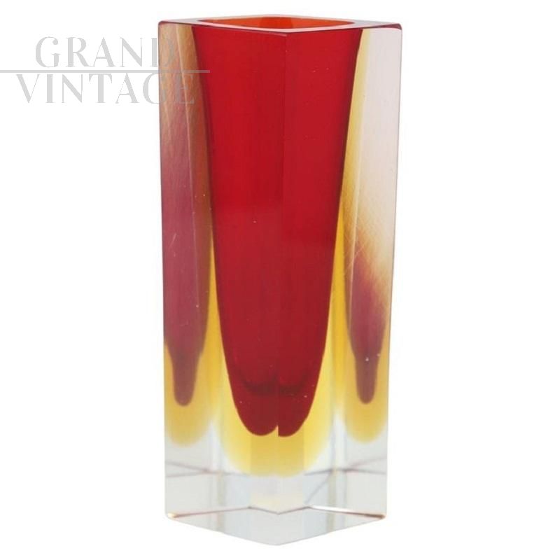 Vaso vintage squadrato in vetro di Murano sommerso rosso e giallo
