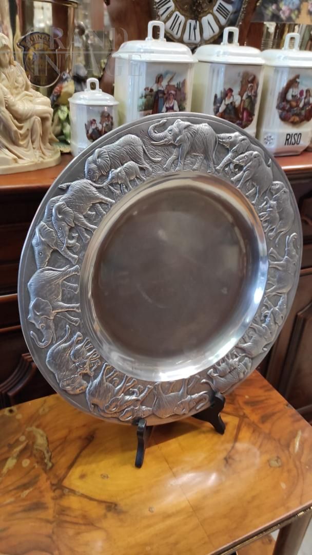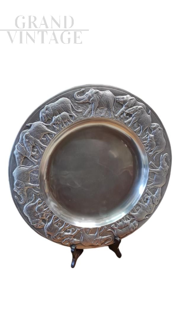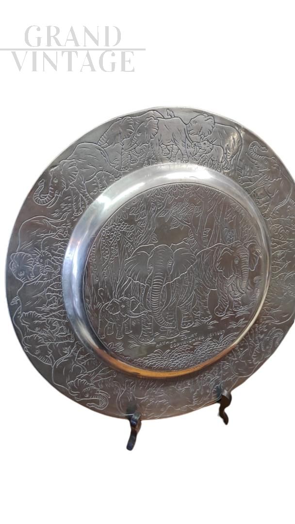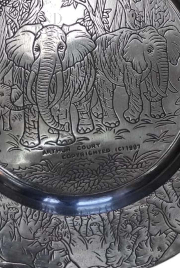 Vassoio decorativo da portata in lega di alluminio con piacevoli decorazioni etniche fronte retro con elefanti a rilievo e graziose incisioni, ben visibile la firma dell'autore Arthur Court e l'anno di produzione 1987. Un oggetto decorativo bellissimo che può essere utilizzato anche come piatto da buffet e antipasti o come vassoio svuotatasche o centrotavola.