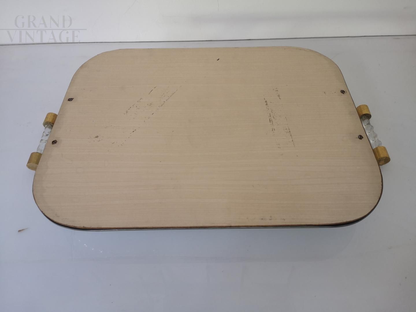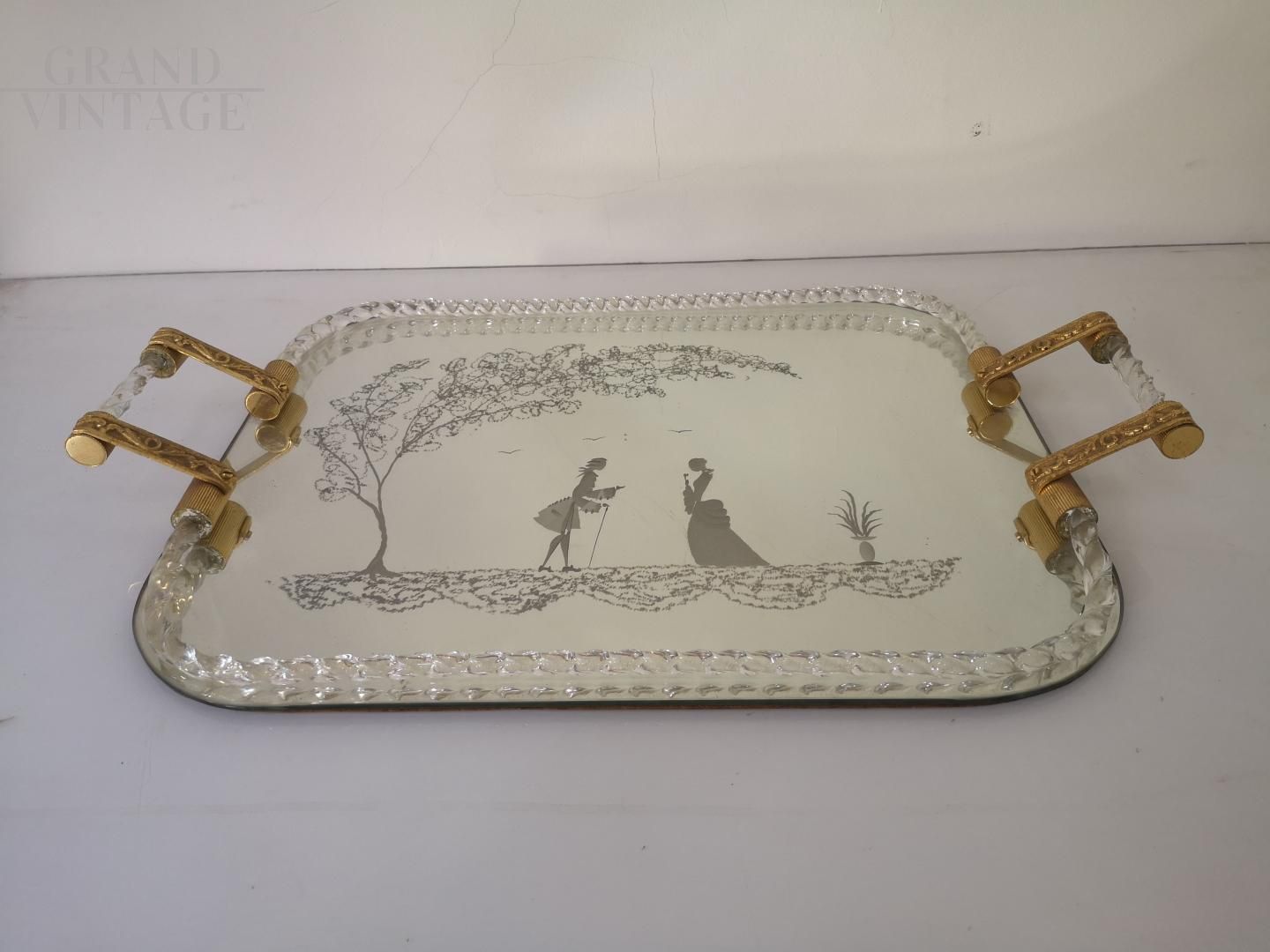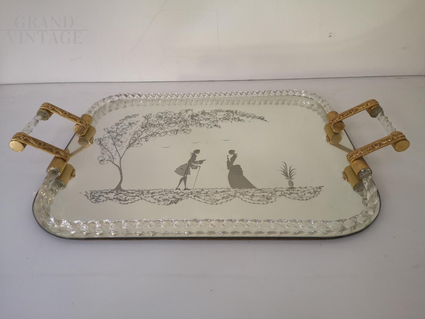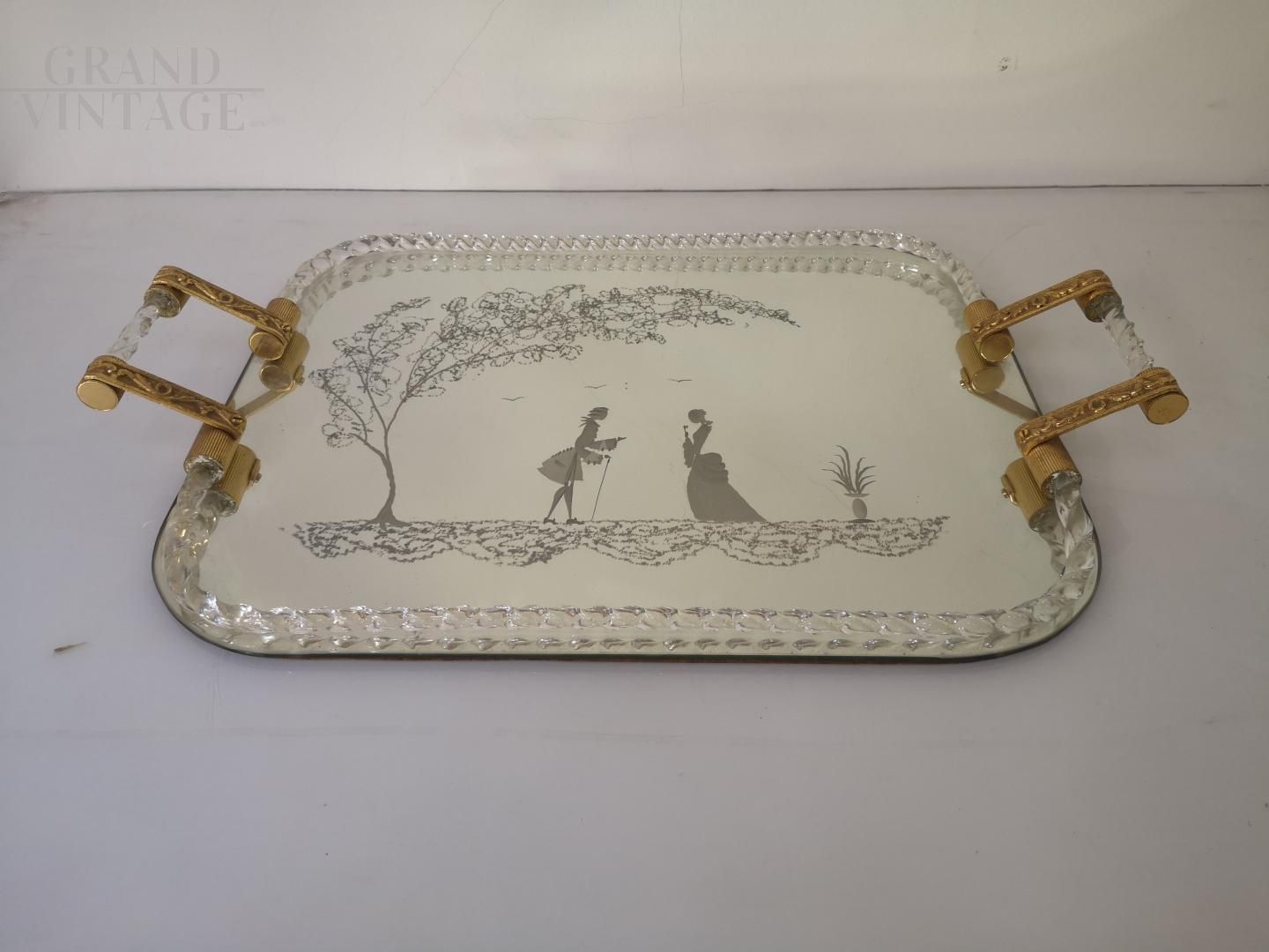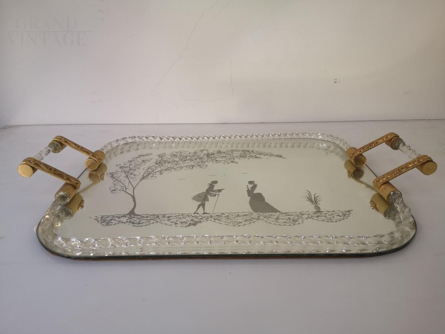 Vassoio vintage design stile Barovier e Toso in vetro di Murano con superficie a specchio decorata con scena galante, gli angoli sono arrotondati con bordo decorato da un cordone di vetro lavorato, le maniglie sono in ottone dorato lavorato e vetro. La parte inferiore presenta una base in legno. Vassoio realizzato a mano negli anni '50 da artigiani veneziani in stile Barovier e Toso.