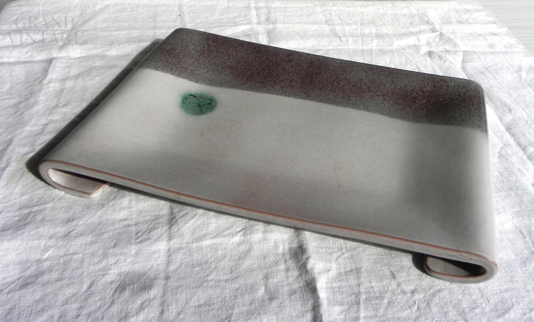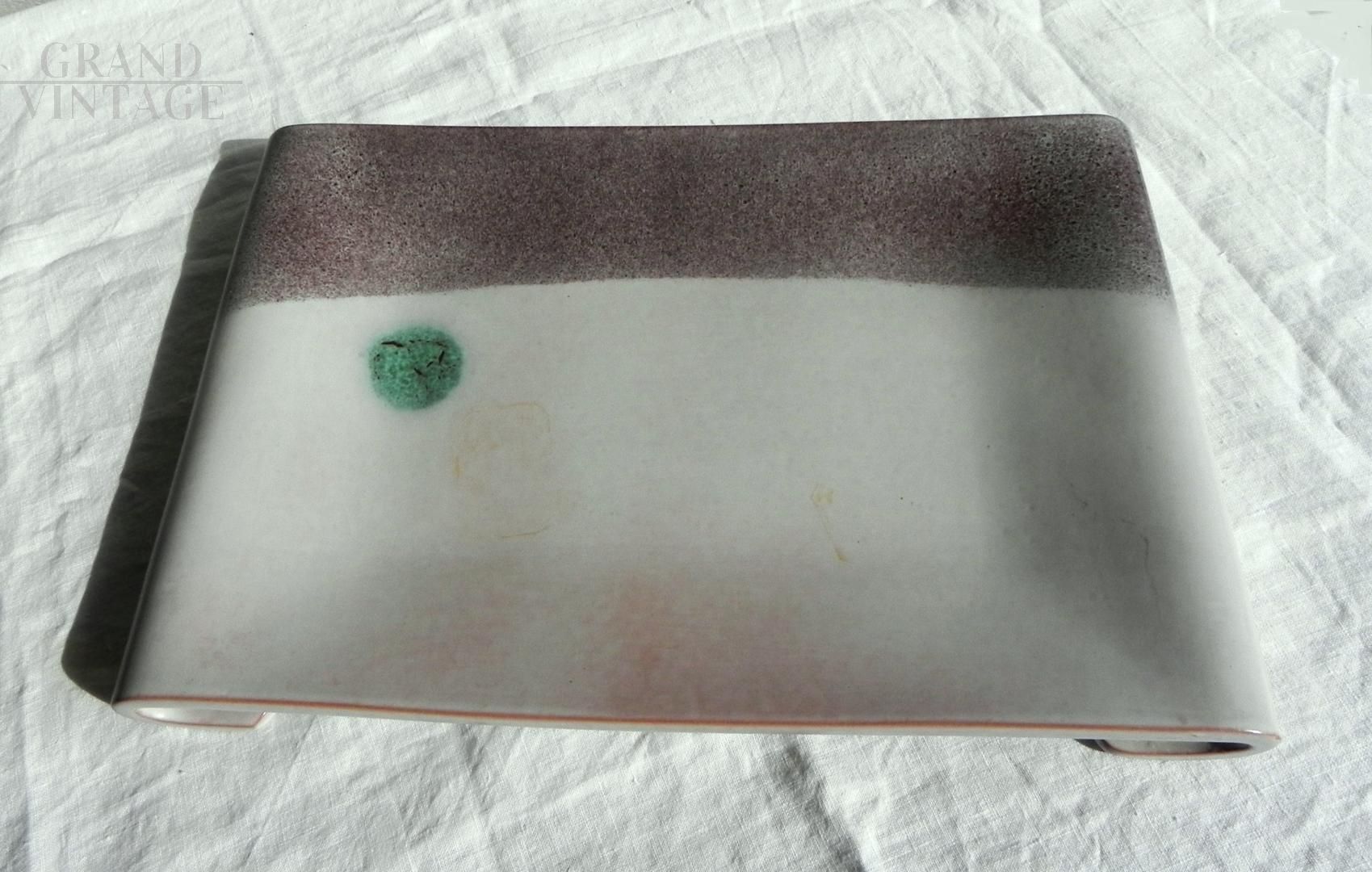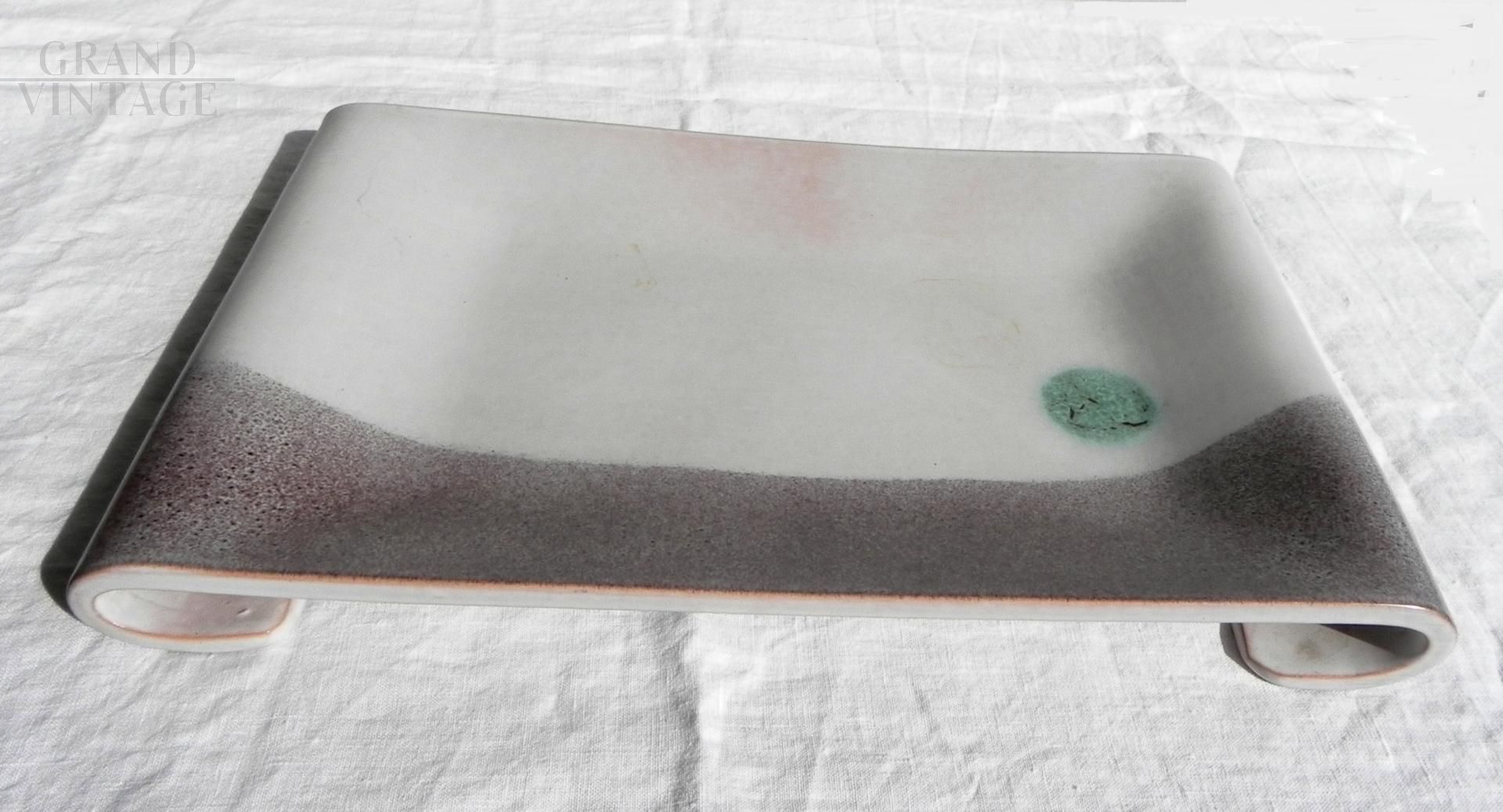 Vassoio vintage firmato La Sfera in ceramica di forte spessore curva ai lati, smaltata e decorata con un sole al tramonto stilizzato, Italia anni '70. In condizioni molto buone, senza sbeccature.