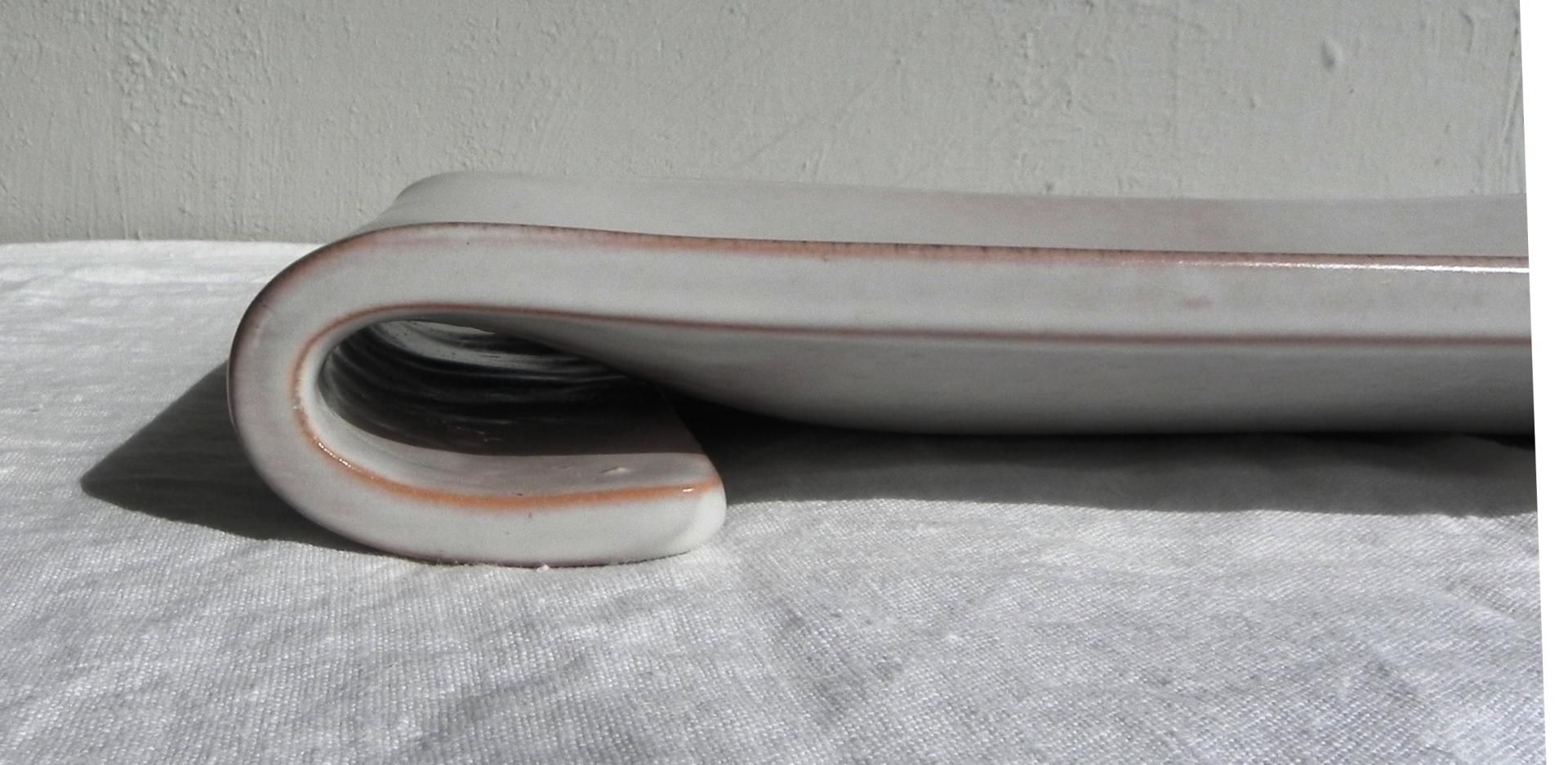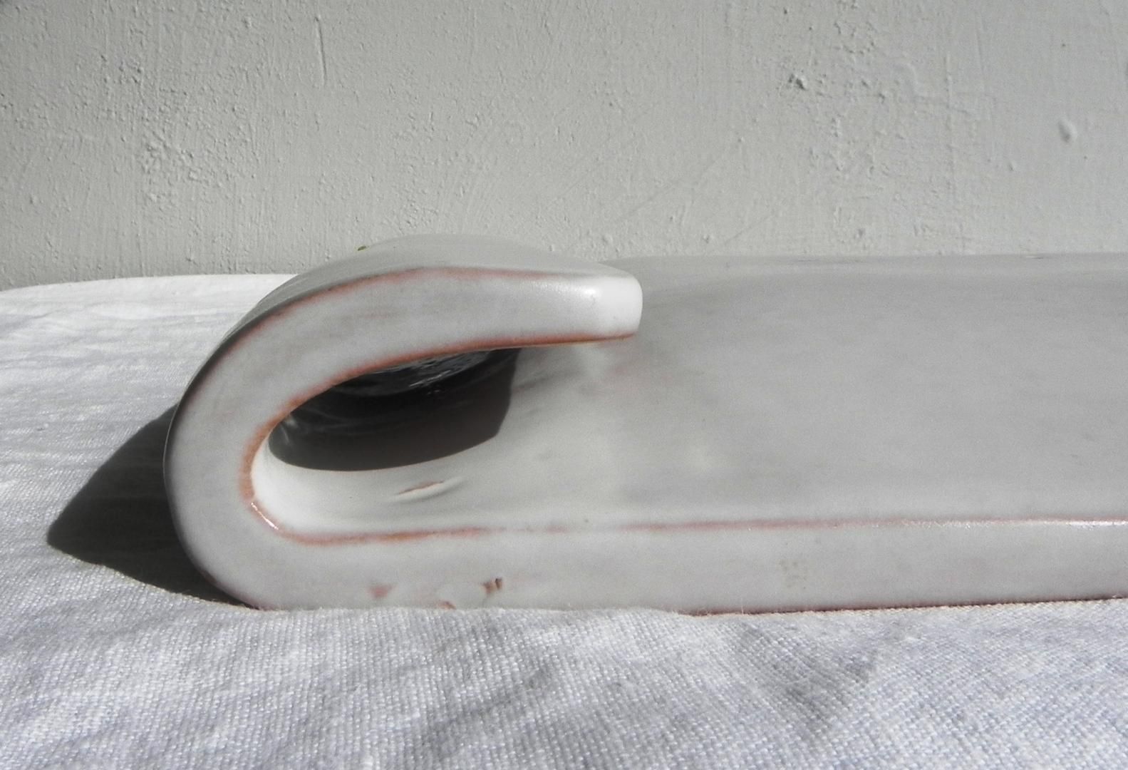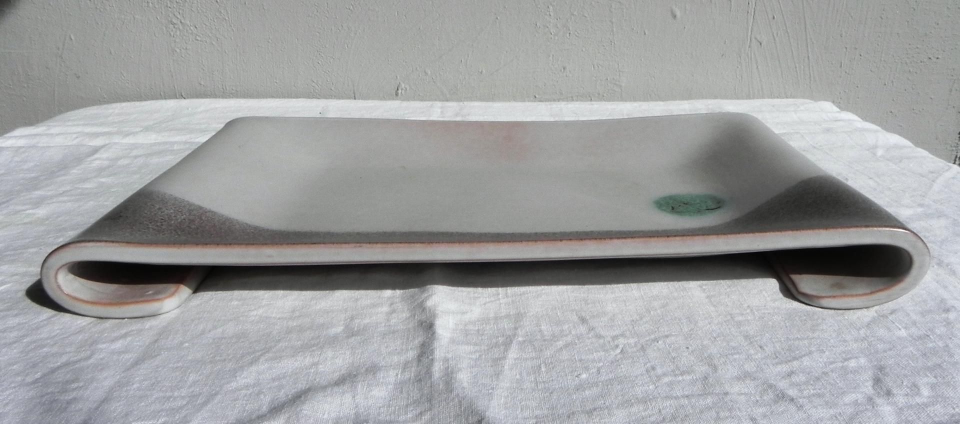 Vassoio vintage firmato La Sfera in ceramica di forte spessore curva ai lati, smaltata e decorata con un sole al tramonto stilizzato, Italia anni '70. In condizioni molto buone, senza sbeccature.